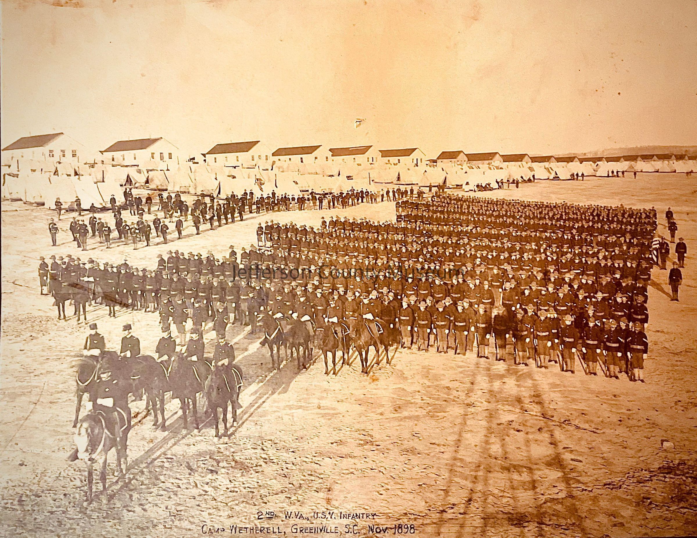 Black and White photograph of 2nd WV US Infantry soldiers in the Spanish American War taken in Greenville, South Carolina at Camp Wetherell, featuring Jefferson County residents.Context