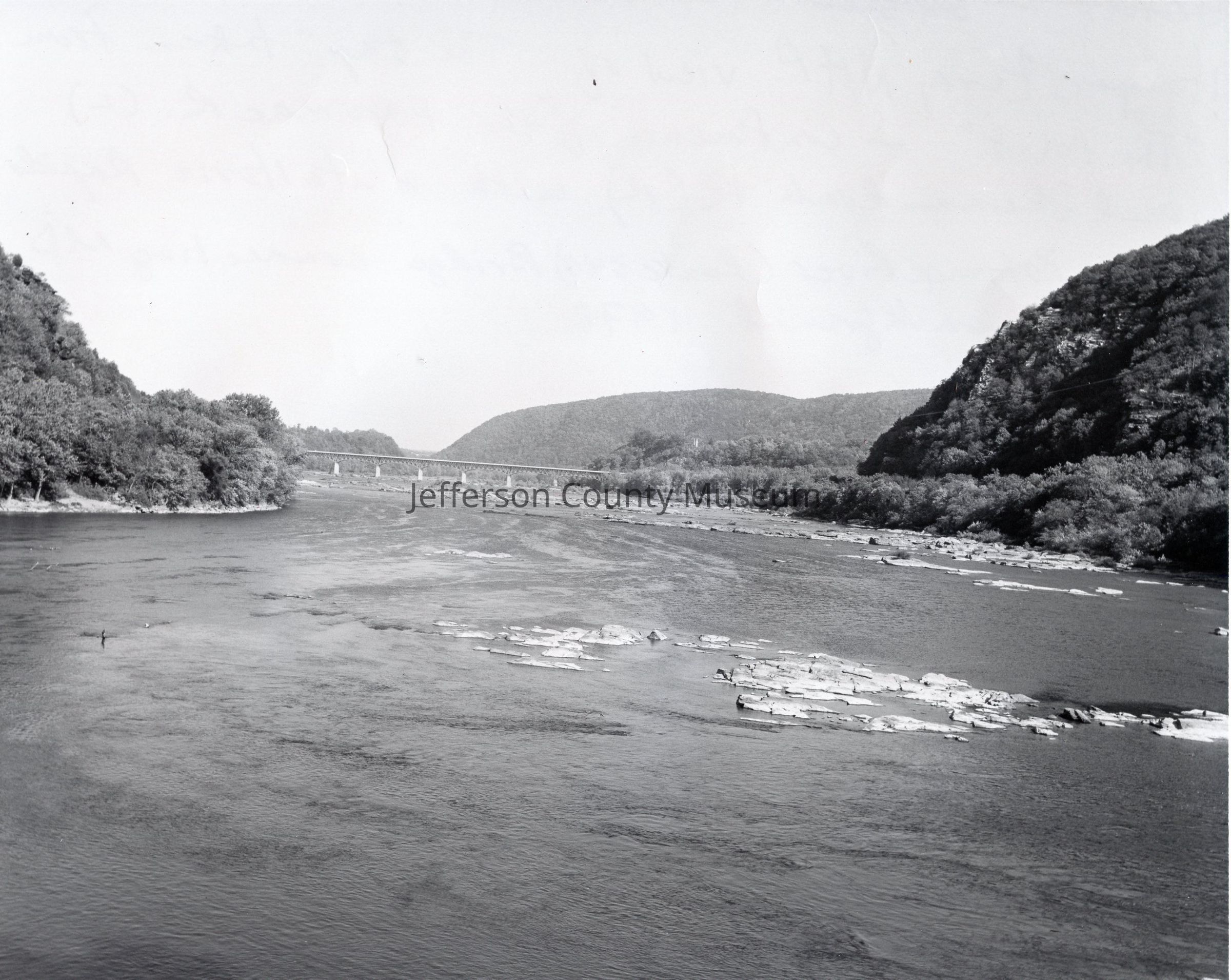 Harpers Ferry Gap. Route 340 bridge in background. The confluence of the Potomac River (left) and the Shenandoah River (right). White Horse Rapids in the gap