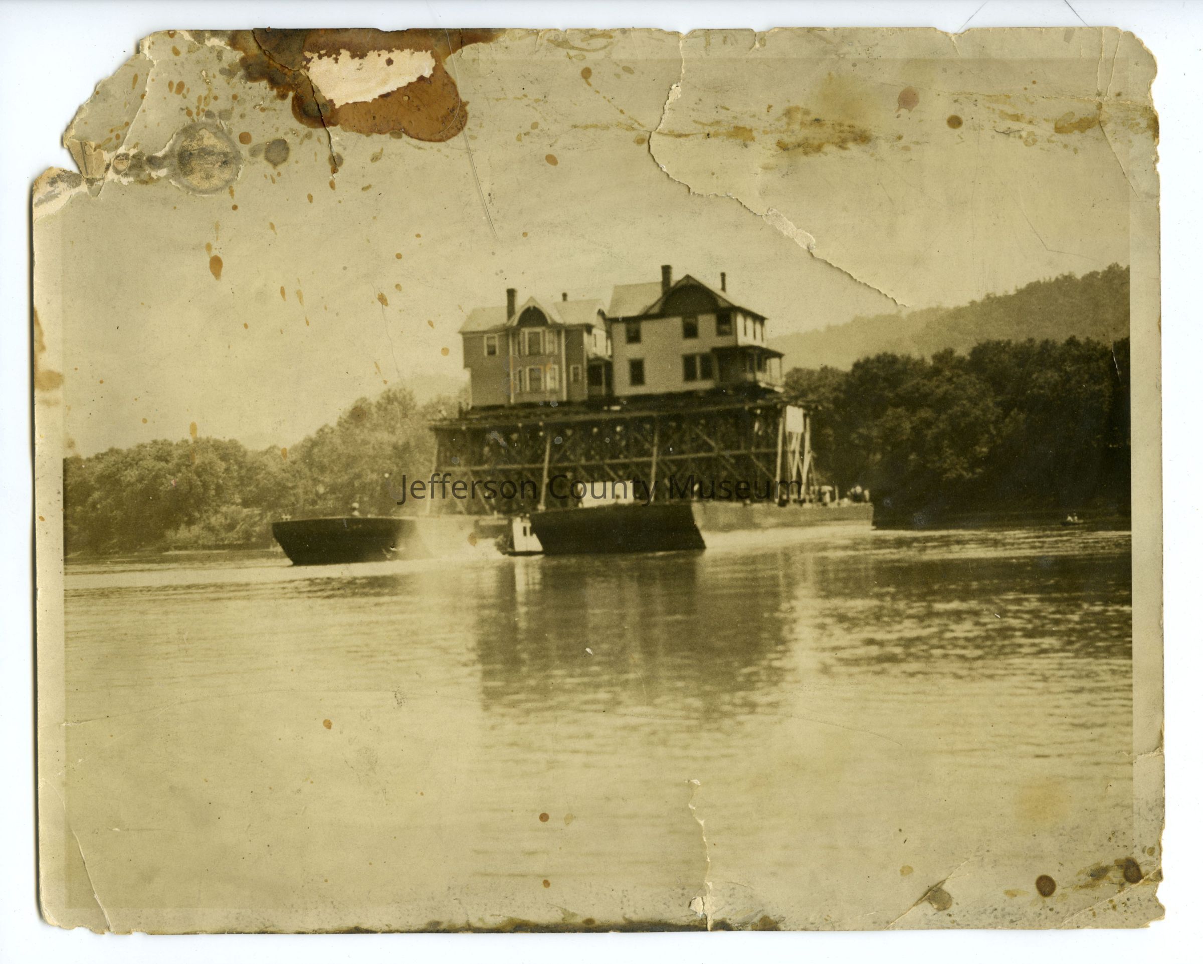Black and white photograph of two houses being transported via boat, possibly along the Shenandoah River. At right is a smaller boat on the river observing.Context