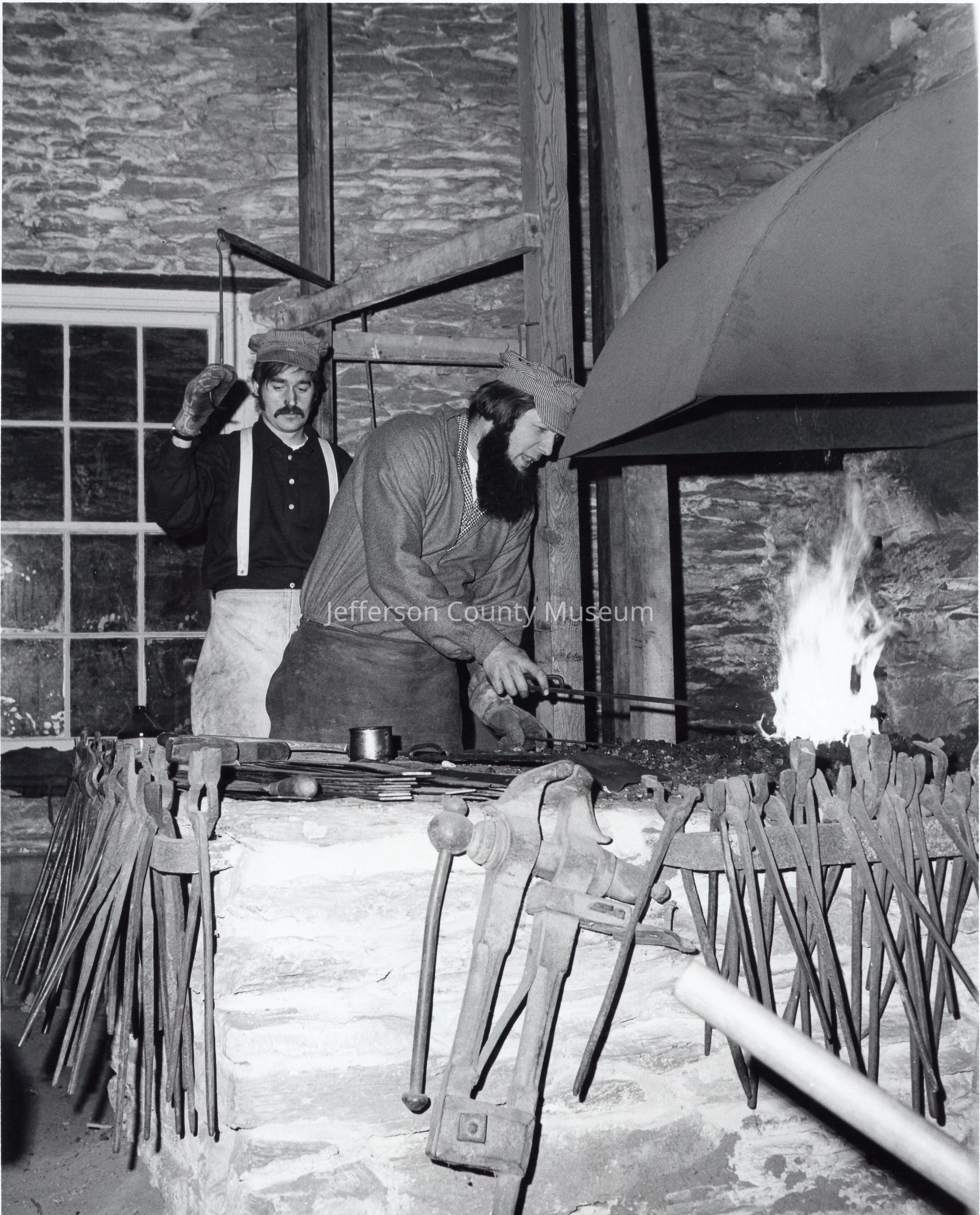 Black-smith living history demonstration - Arnold Schofield is the blacksmith; helper is unidentified. Forge was located in the McCabe-Marmion building on Shenandoah Street; currently the location of the Harpers Ferry National Historical Park's Industry Museum.