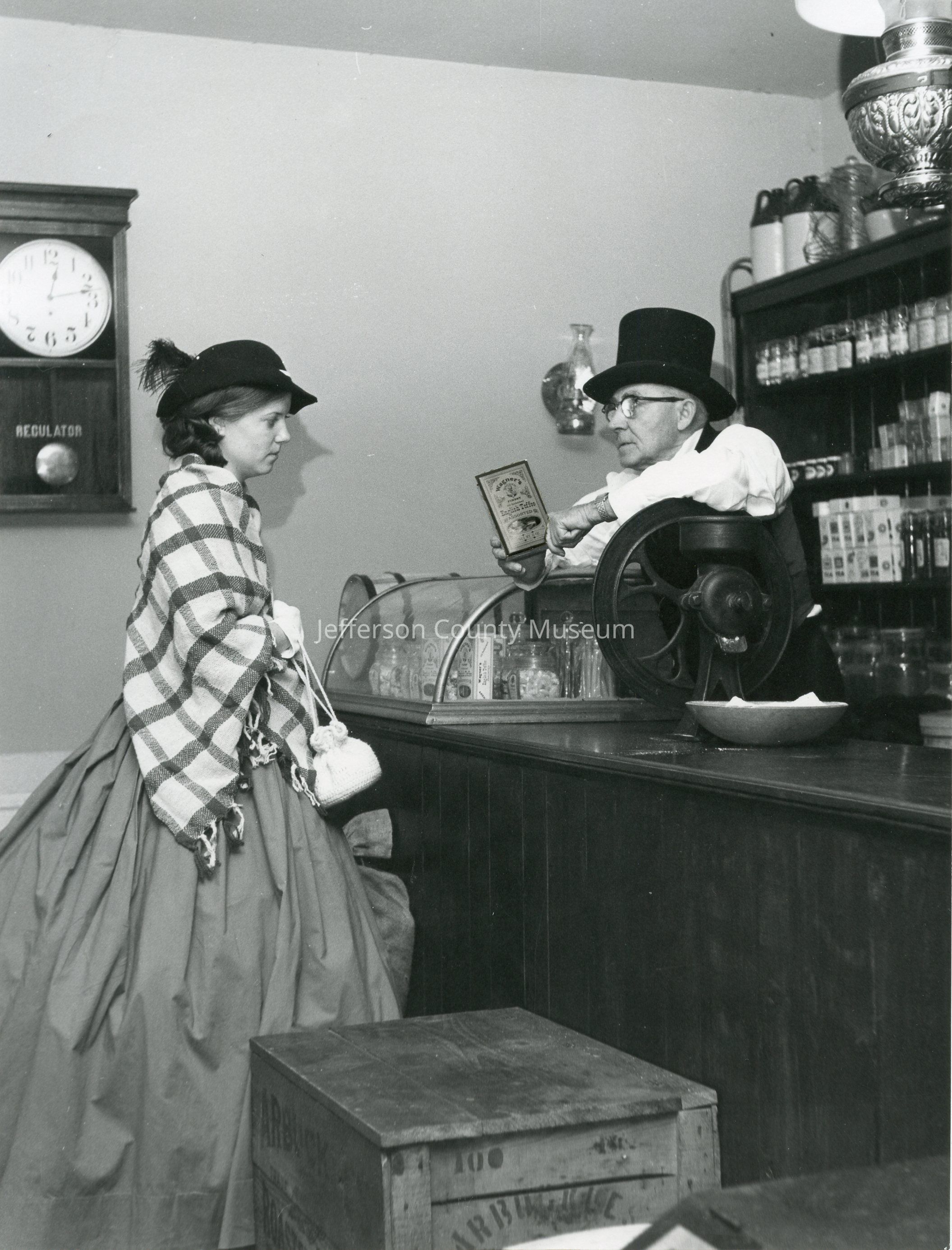 General store living history demonstration. Jesse Engle, store clerk, on right; patron unidentified. General store located in the Joseph Ania building (old superintendent's quarters) on Shenandoah Street.
