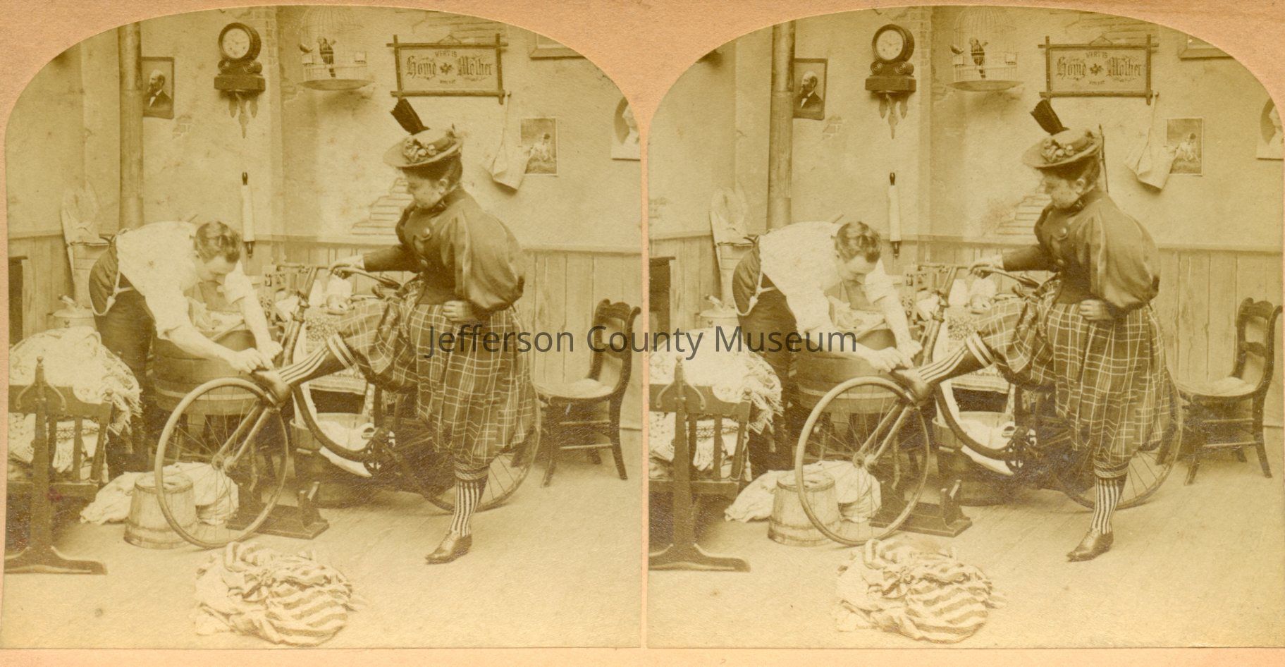 Stereograph of a man tying a woman's shoe entitled "He stoops to serve". Copyright 1897