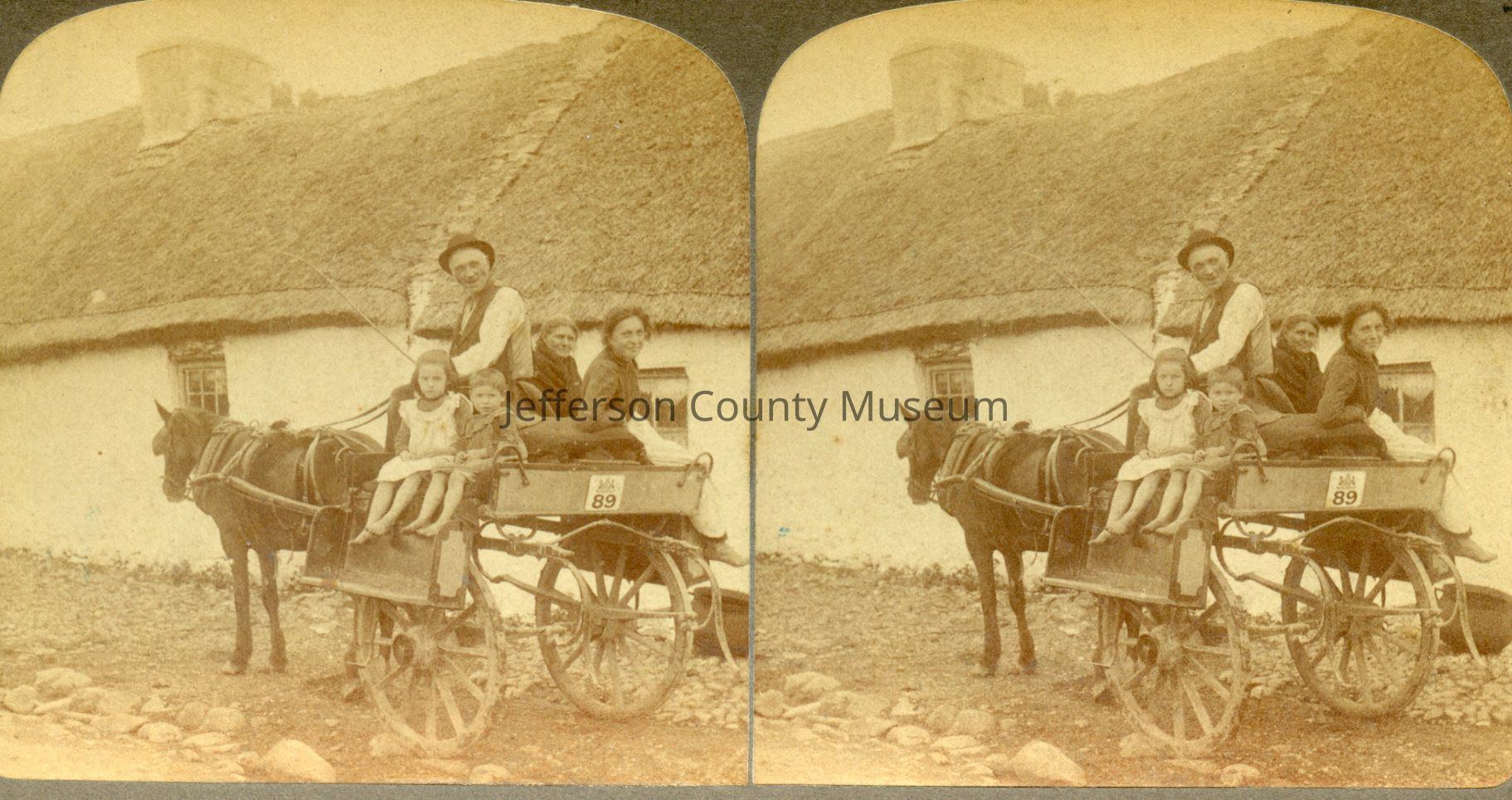 Stereograph of men, women, and children in a cart in Ireland. Copyright 1896