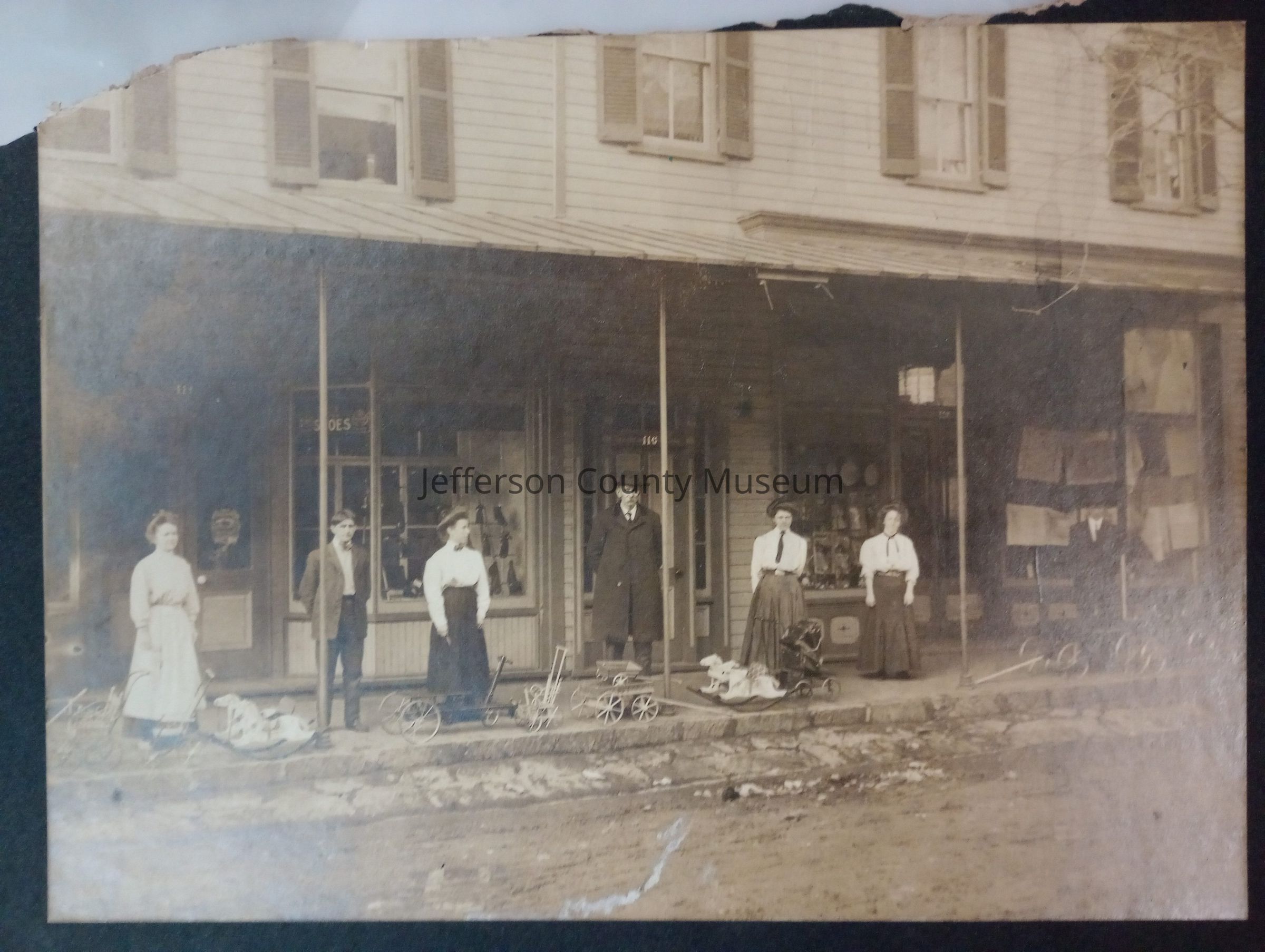 Mounted photo of four weone and three men standing in front of the Grandstaff building in CHarles Town with toys such as wagons and rocking horsese in the foreground and a window full of shoes in the background.Acquisition