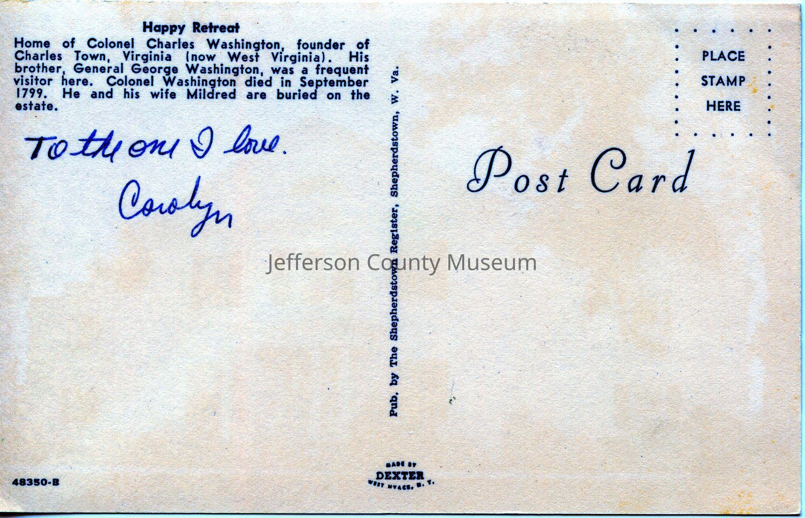 Happy Retreat: Home of Colonel Charles Washington, founder of Charles Town, Virginia (now Virginia). His brother, General George Washington, was a frequent visitor here. Colonel Washington died in September 1799. He and his wife Mildred are buried on the estate.Acquisition
