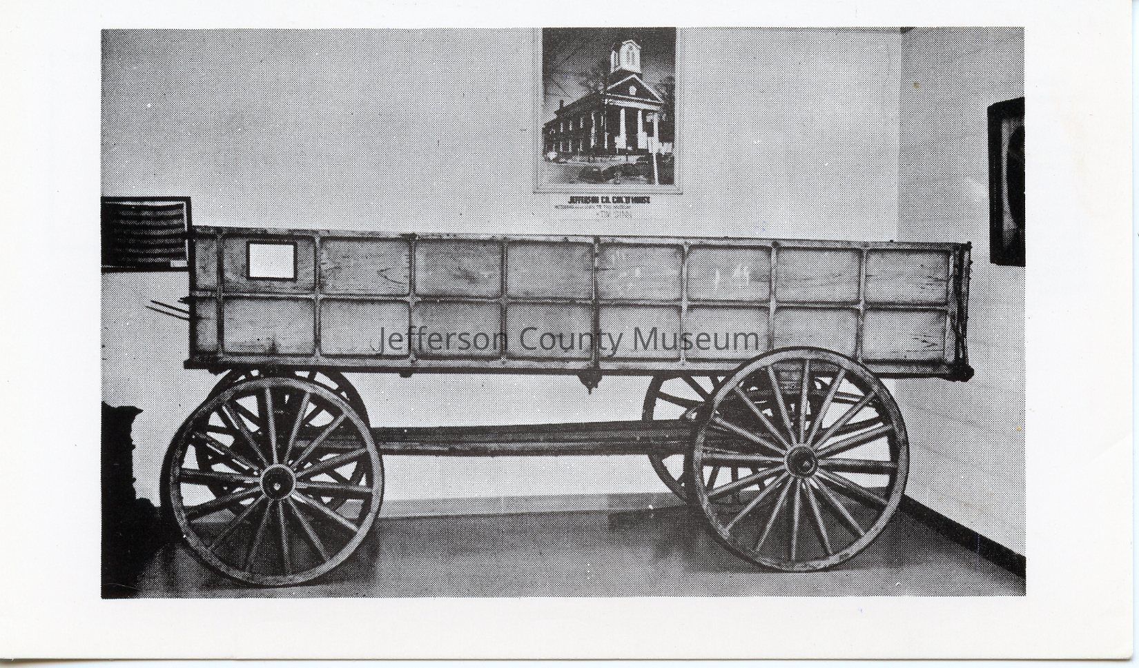 John Brown, after being tried and convicted of treason against the commonwealth of Virginia, was taken from Charles Town, Virginia Jail, December 2, 1859, in this wagon, seated upon his own coffin therein, to the place of his execution of South Samuel Street. The wagon was drawn by two white horses. It was preceded by Sheriff J. W. Campbell, Jailor John Avis and George W. Sadler, all on foot. It was flanked by three companies of infantry. After the execution the coffin, containing the body of John Brown, was taken in this wagon to the B&O Station in Charlestown, for shipment to the place of burial in North Elba, New York. (The John Brown wagon was given to the Jefferson County Museum by Melvin T. Strider and Frank L. Ronemous, Owners)Acquisition