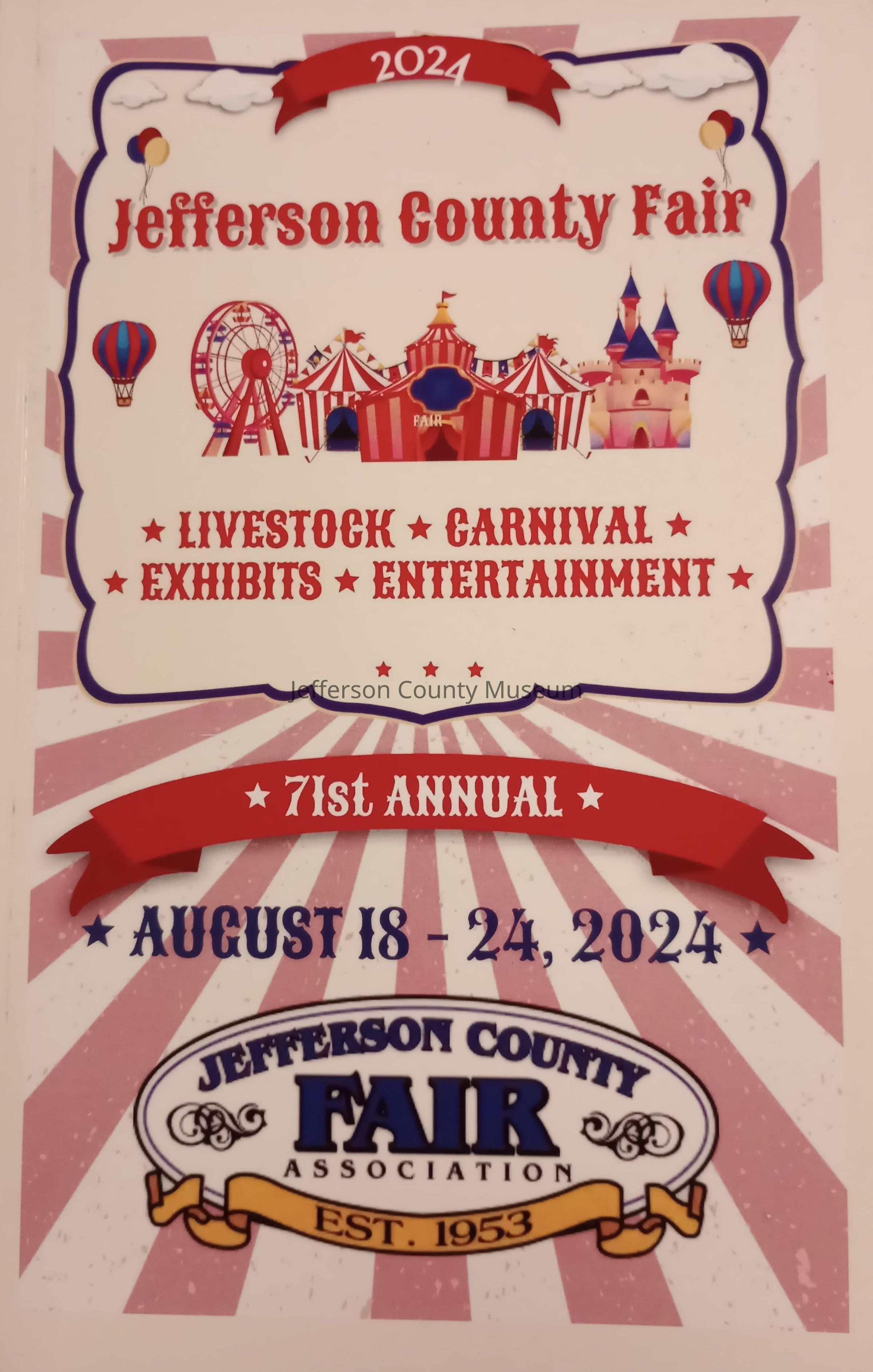 Program for the 2024 Jefferson County Fair, which took place from August 18-24. The cover is white and red featuring illustrated images of a carnival. Contains rules and entry information for various fair contests as well as advertisements.Acquisition