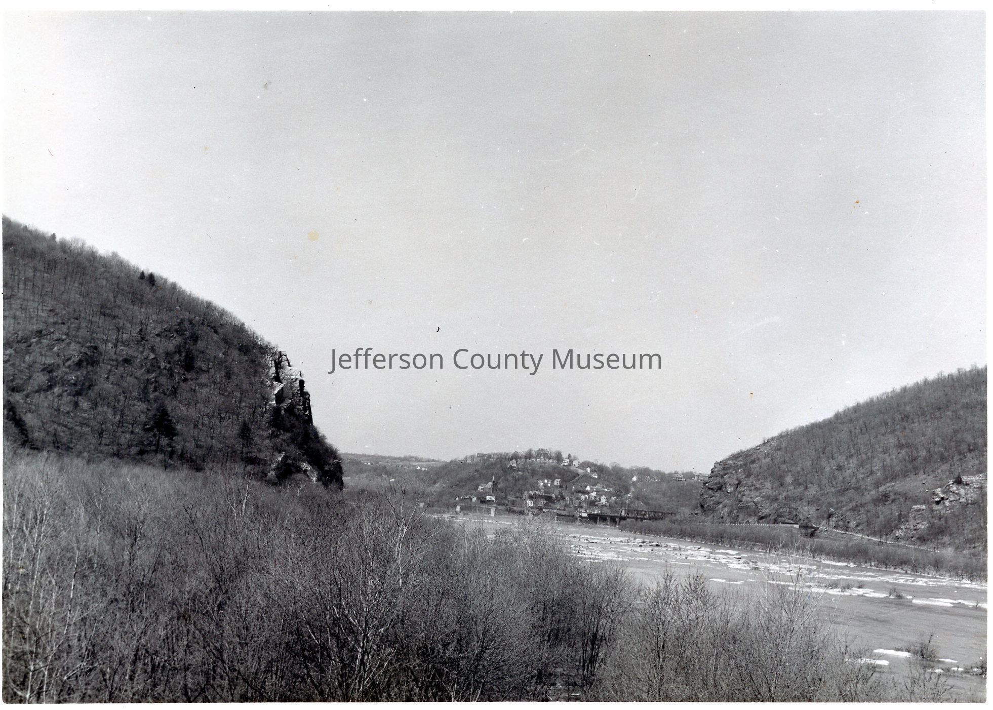 View of Harpers Ferry from the Route 340 Bridge over the Potomac River c. 1955. Loudoun Heights is on the left, the Harpers Ferry Gap and White Horse Rapids are in the center, and Maryland Heights is on the right.Acquisition