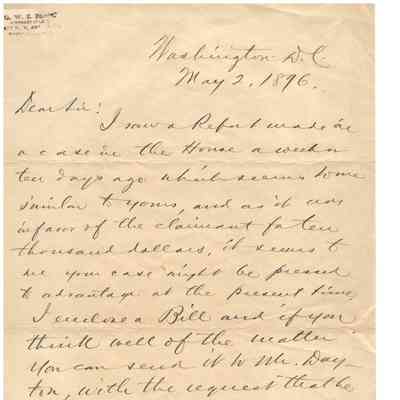 -Letter (with envelope) to George Koonce of Halltown from GWZ Black of DC, May 2, 1896. Letter advises Koonce that a similar claims case to his, relating to a house recently came up, and that it might be an advantageous time to press his claim.