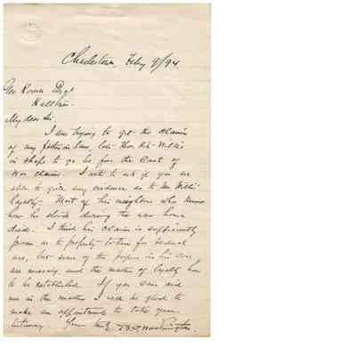 -Letter to George Koonce in Halltown from Bushrod Corbin Washington, Dated Feby 9/94 from Charlestown, requesting assistance with the claim of Washington's late father in law, Hite Willis, for property taken for Federal use during the Civil War. Washington notes that "some of the propers in his case are missing, and the matter of loyalty has to be established"