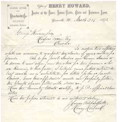 -Letter to George Koonce from Henry Howard, dated March 25, 1873, enclosing two affadavits necessary for his mother to receive a pension with instructions on getting them filled out by Jacob and Susan (?) Shriver.