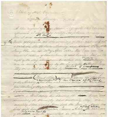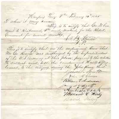 -Letter "To Whom it may Concern" dated February 10, 1865, certifying that George W. Conners (?) worked for the Rebel Government for several months in Richmond (signed by SVB Strider) and to certify that George Koonce was authorized by the Superintendent of the Harpers Ferry Armory to "collect and sell the condemned Halls Rifles" to the citizens during the John Brown Raid signed by seven men.