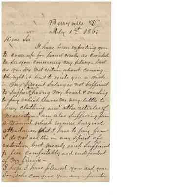 -Letter addressed "Dear sir" and signed by Geo I (?) in Berryville, Va, asking for a raise in salary due to cost of living and healthcare for a wound requiring surgery. Dated July 1, 1865