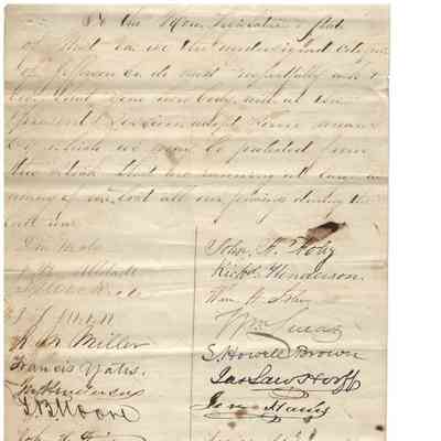 -Petition "To the Hon. Legislature and State of West Va." from citizens of Jefferson County to "adopt some means by which we may be protected from the Stock that are running at large as many of us have lost all our fencings during the late war." (Undated) Includes signatures of numerous local residents, including S. Howell Brown.