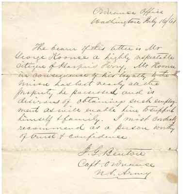 -Letter of recommendation for employment for George Koonce from the Ordnance Office in Washington, July 16, 1861, signed by J.G. Beutore (?), Capt of Ordnances at the US Army, stating that Koonce "lost nearly all the property he possessed" due to his loyalty to the Union.