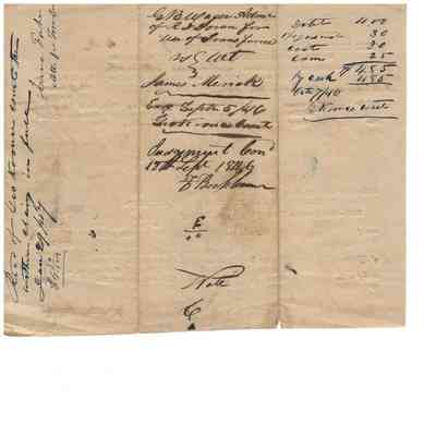 -Court summons for James Merick to appear before the Justice of the Peace at Koonce's Office on Sept 1, 1846, with notes about Merick's debt on the back.
