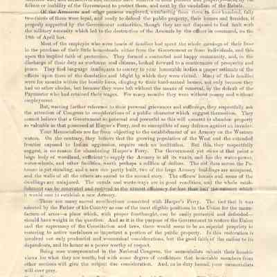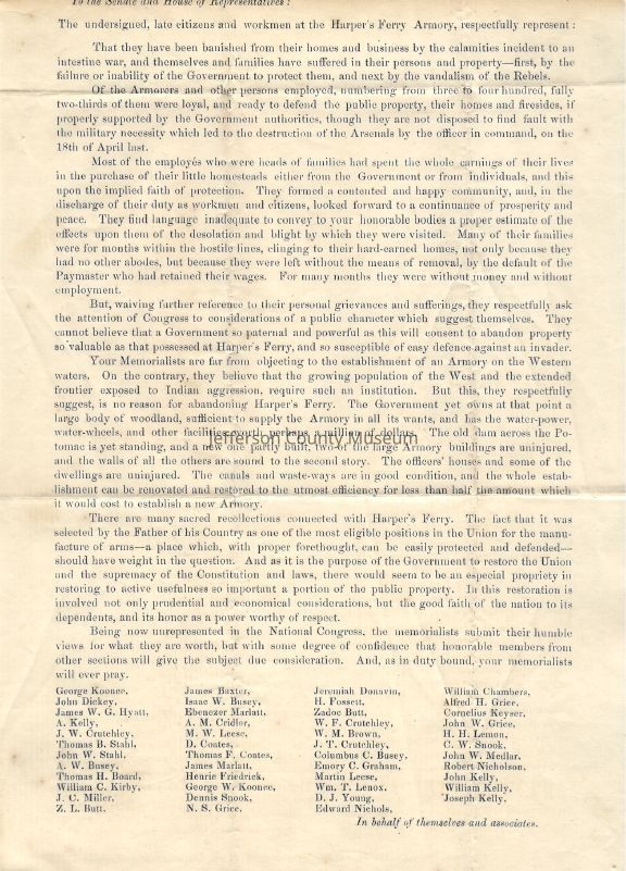- Typed broadside, undated, petition on behalf of the workers at the Harpers Ferry Armory. Written sometime after its destruction in 1861. The undersigned describe their hardship due to loss of property and livelihood as Union supporters and request that the government rebuild the Harpers Ferry Armory and argue that it is a preferable alternative to building a new one elsewhere.
