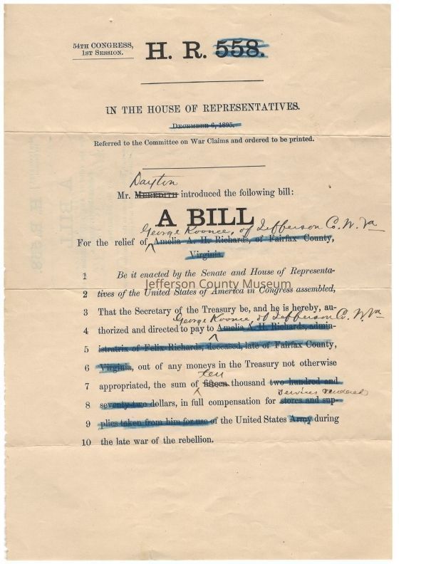 -Draft of Congressional bill for the relief of George Koonce of Jefferson County, using a different claim as a model, for compensation for services rendered to the US government during the Civil War (undated, likely c.1895-1897 due to it being the 54th Congress).Acquisition