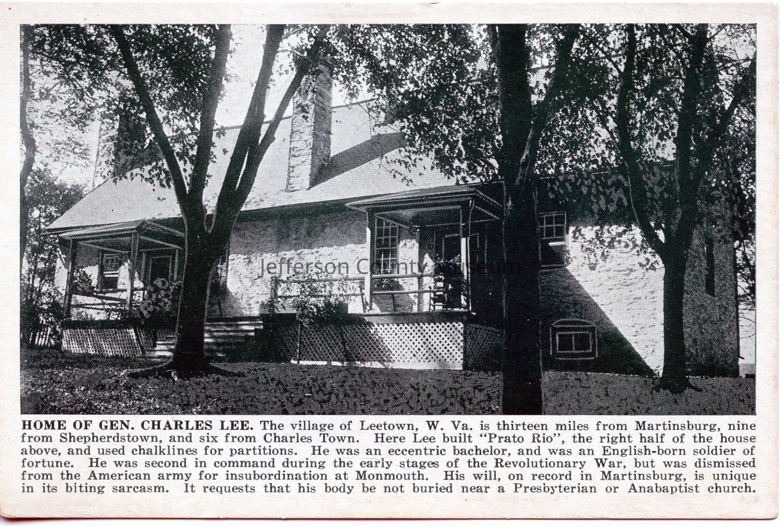 Home of Gen. Charles Lee- The village of Leetown, West Virginia, is thirteen miles from Martinsburg, nine from Shepherdstown, and six from Charles Town. Here Lee built "Prota Rio", the right half of the house above, and used chalklines for partitions. He was an eccentric bachelor, and was an English-born soldier of fortune. He was second in command during the early stages of the Revolutionary War, but was dismissed from the American Army for insubordination at Monmouth. His will, on record in Martinsburg, is unique in its biting sarcasm. It request that his body not be buried near a Presbyterian or Anabaptist church.Acquisition