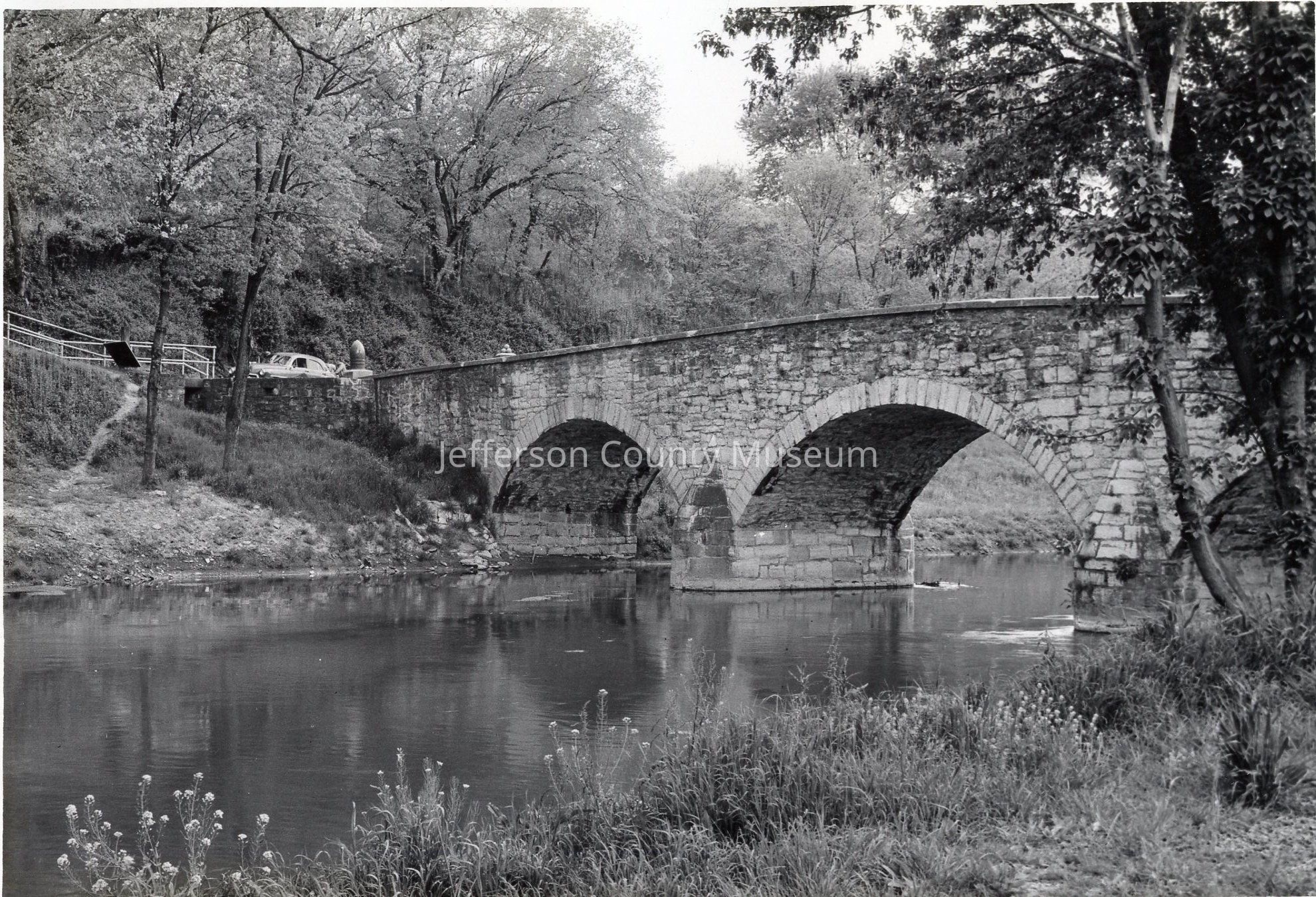 View of the Burnside Bridge (Middle Bridge) over Antietam Creek southeast of Sharpsburg, Maryland c. 1955. Photograph is taken from the south (downstream) side of the bridge looking from the east to the west end of the bridge. When this photograph was taken the bridge still carried vehicular traffic. The bridge figured prominently in the afternoon phase of the Battle of Sharpsburg on September, 17th, 1862. The monuments seen on the west end of the bridge have since been removed to the banks of Antietam Creek on the opposite shore. Also visible adjacent to the west end of the bridge are handrails along the footpath which leads to the observation deck on the cliffs overlooking the bridge.Acquisition