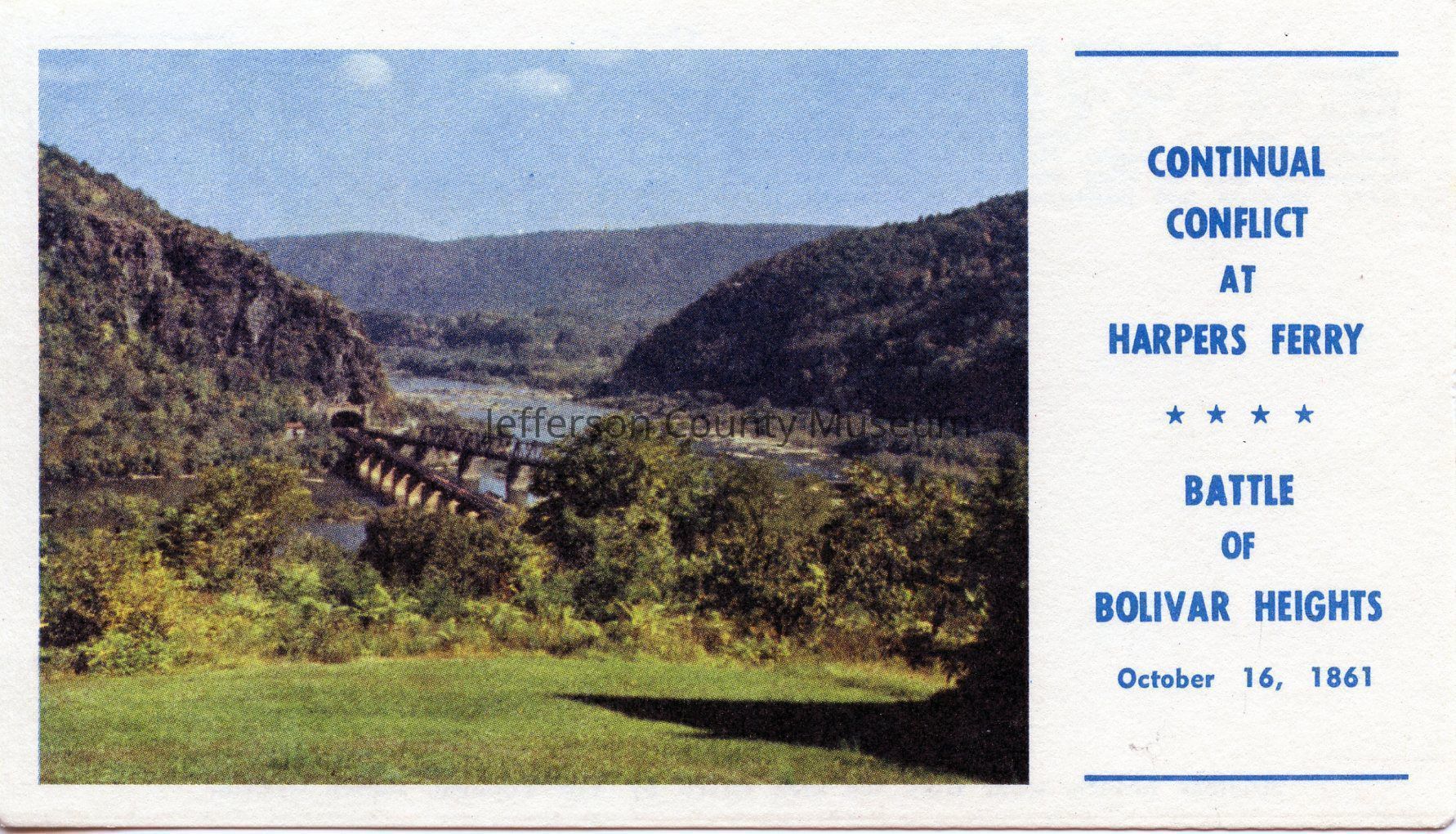 Continual Conflict at Harper's Ferry- Battle of Bolivar Heights October 16, 1861- Harper's Ferry, West Virginia, was the scene of continual conflict during the Civil War. On October 16, 1861, Federal leader Col. John W. Geary drove the Confederates under Lt. Col. Turner Ashby from their position on Bolivar Heights. Harper's Ferry and the surrounding area is being restored and now has many museums and interesting tourist attractions.Acquisition
