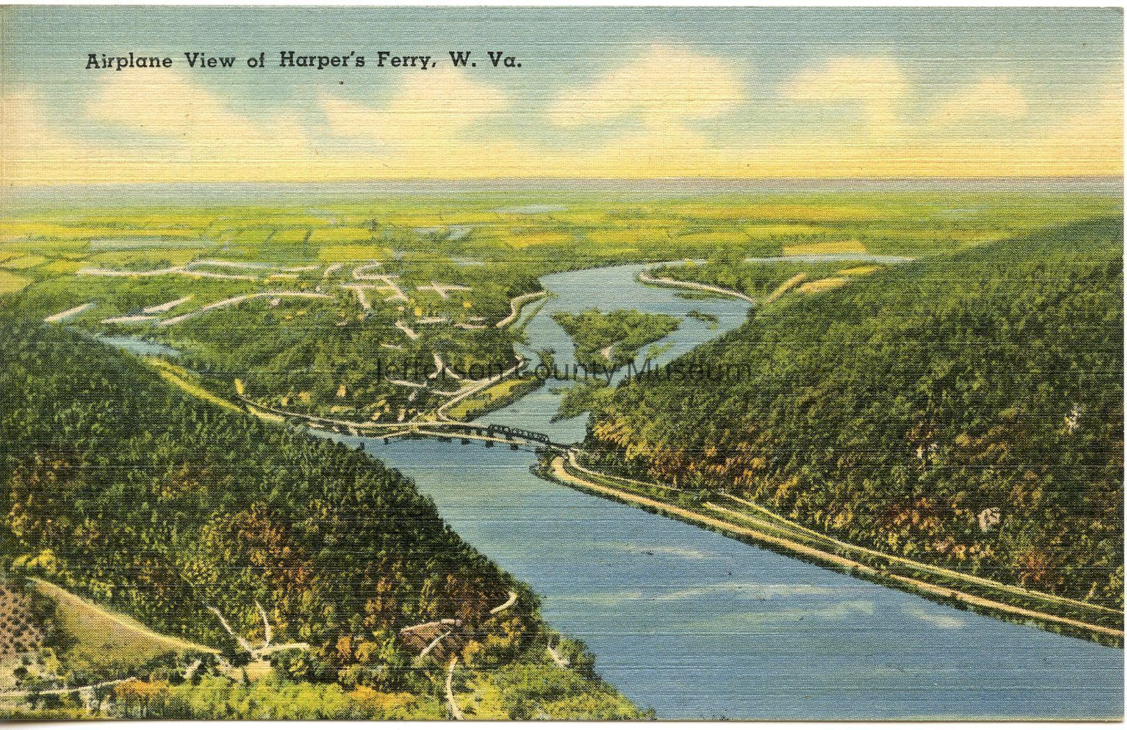 Airplane view of Harper's Ferry, West Virginia. Harper's Ferry, West Virginia is the lowest point in the state having an elevation of 272 feet above sea level. This view shows the confluence of the Shenandoah and Potomac Rivers.Acquisition