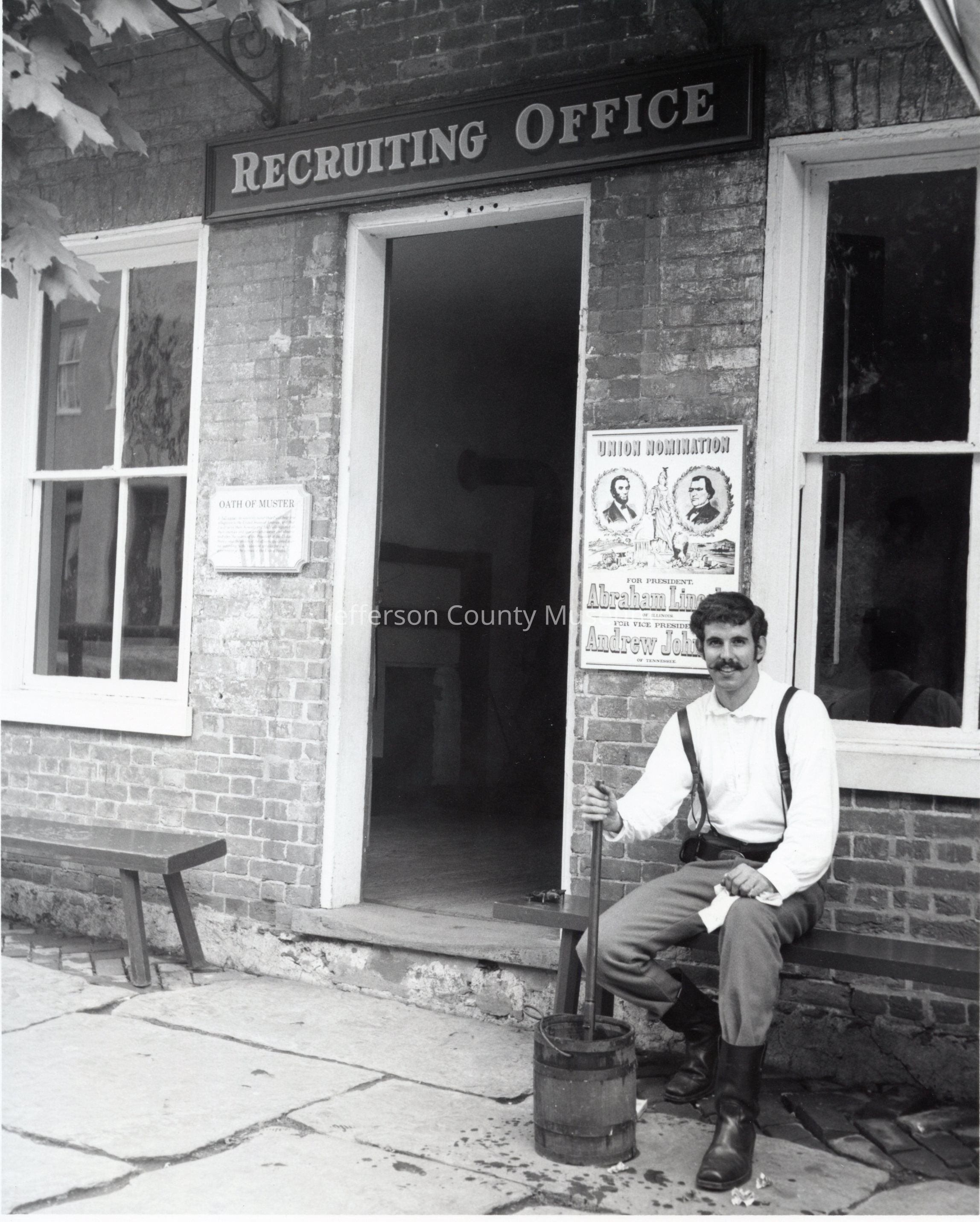 Recruiting office located on Shenandoah Street in the McGraw building. In front, Richard "Dick" Tabb, a living history park ranger, is portraying a Union soldier demonstrating cleaning a gun barrel