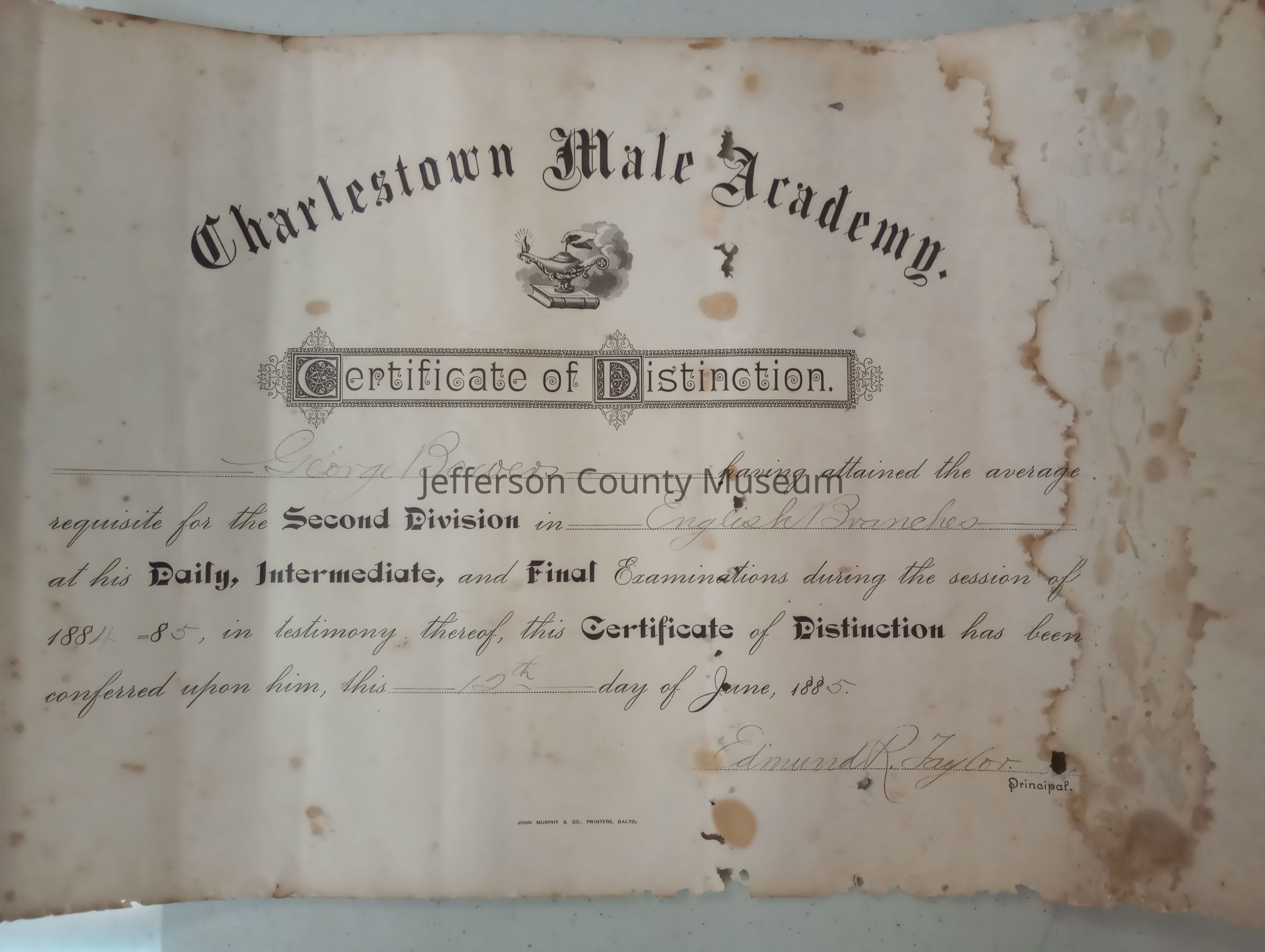 Certificate of Distinction for "English Branches" at the Charles Town Male Academy, awarded to George Bowers.Acquisition