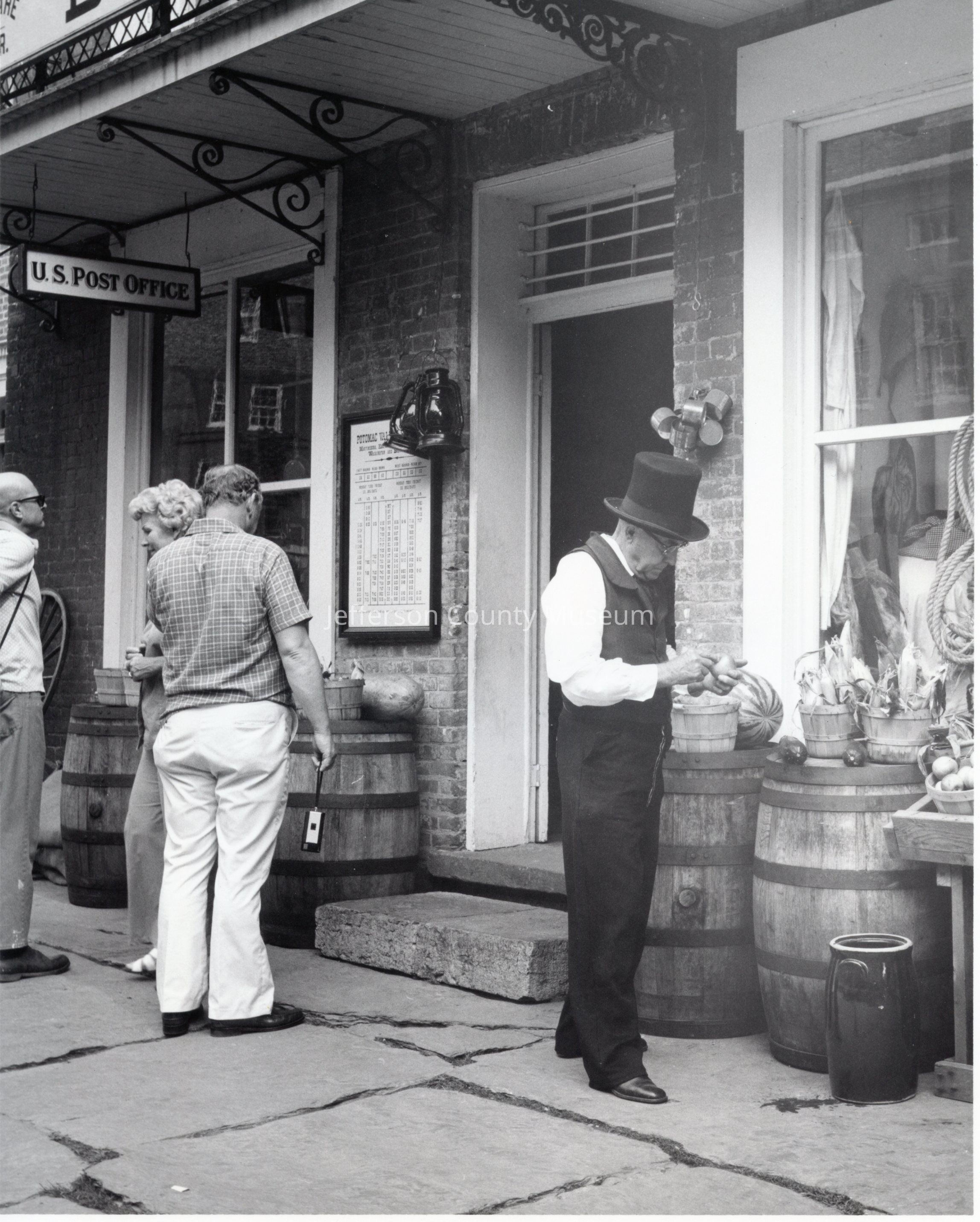 Dry goods store on Shenandoah Street. Living history ranger Jesse Engle portraying a shopkeeper. Park visitors seen looking at wares. Old Master Armorer's building.