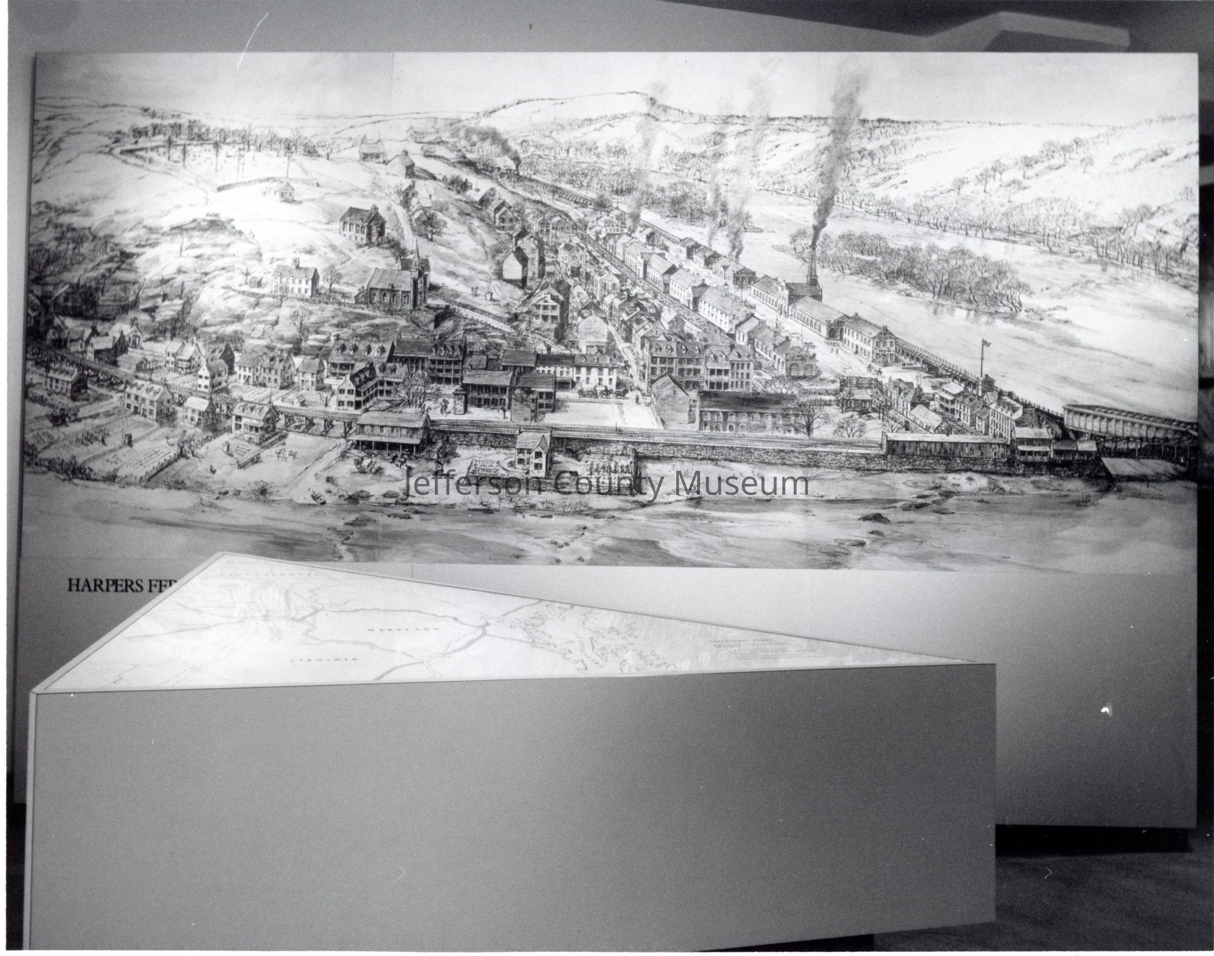 Depiction of what Harpers Ferry lower town looked like in 1859. The triangular object in the foreground is covered by a physical map of the Harpers Ferry area.