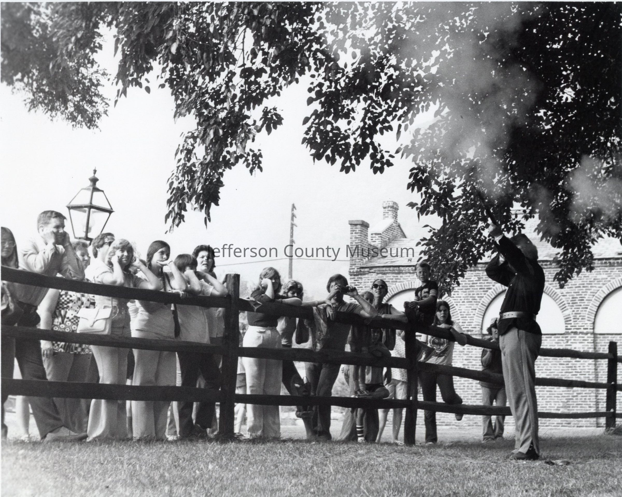 Black powder demonstration. Unidentified living history park ranger firing percussion musket in Arsenal Square for visitors. John Brown's fort in background.