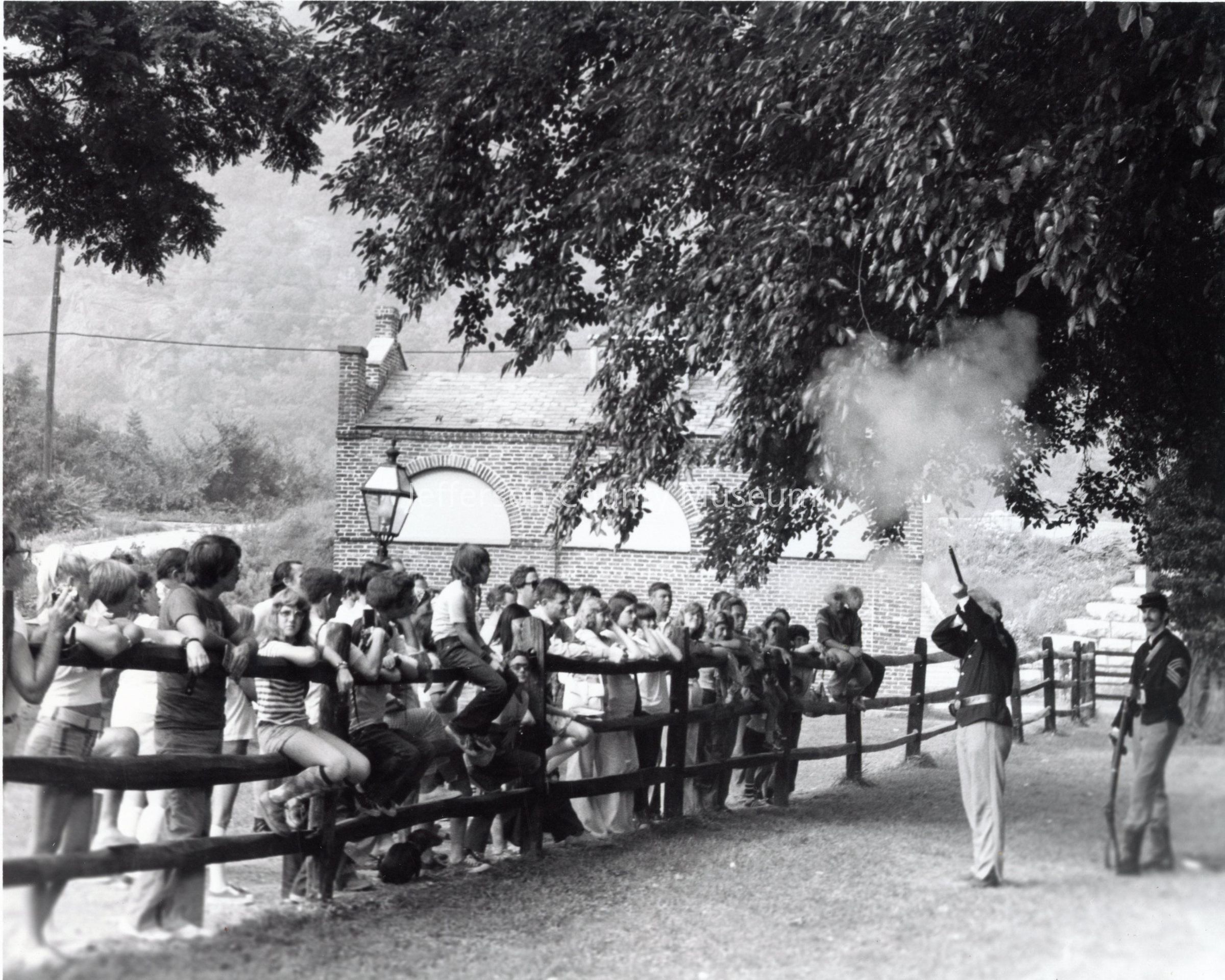 Black powder demonstration. Two unidentified living history park rangers firing a percussion and flintlock musket in Arsenal Square for visitors. John Brown's Fort in background
