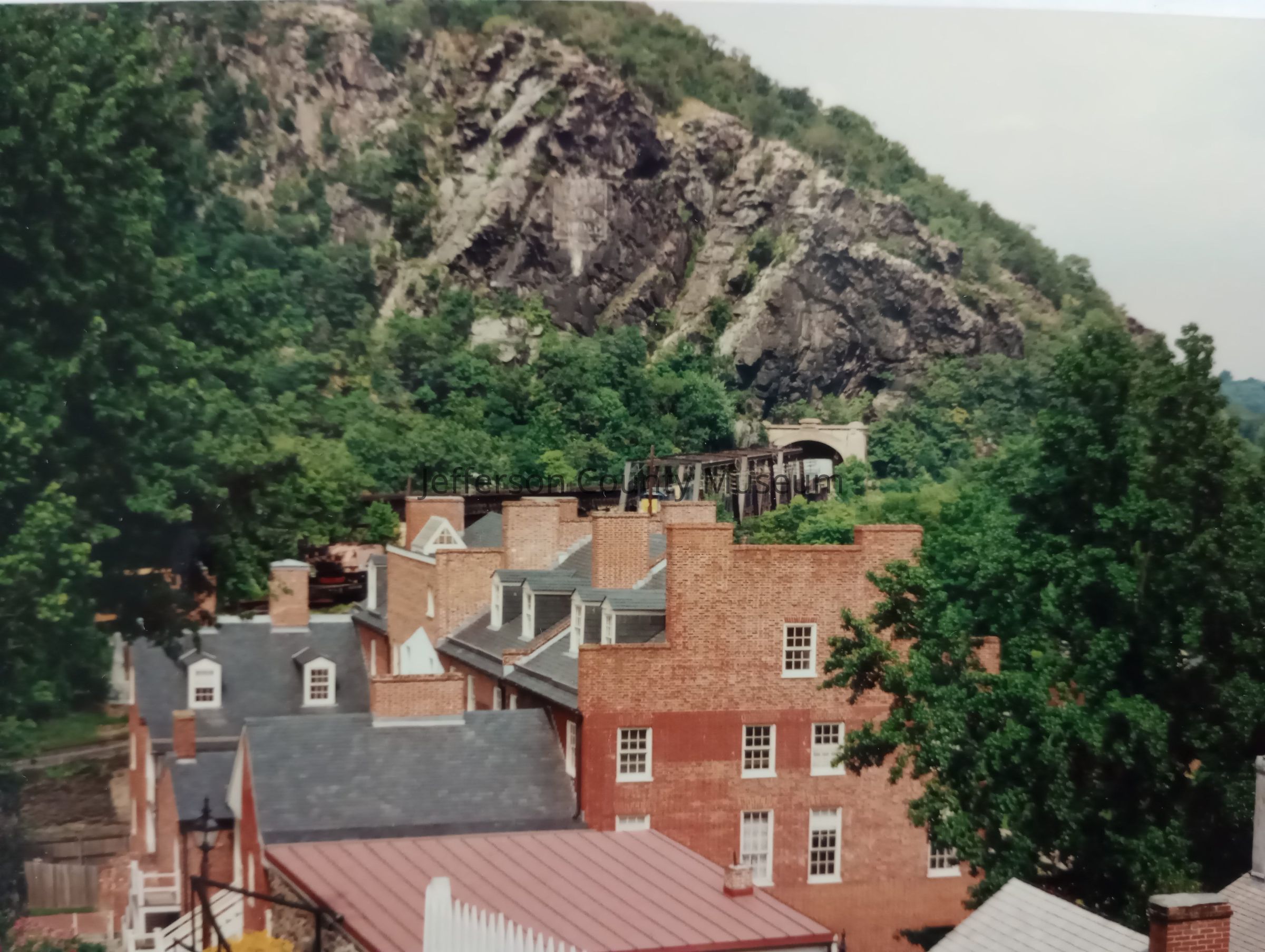 Color photograph taken from the Stone Steps in Harpers Ferry. Shows Maryland Heights with Mennen's advertisement, a train heading into the tunnel, and the rooftops of several buildings in the lower town.Photograph Details