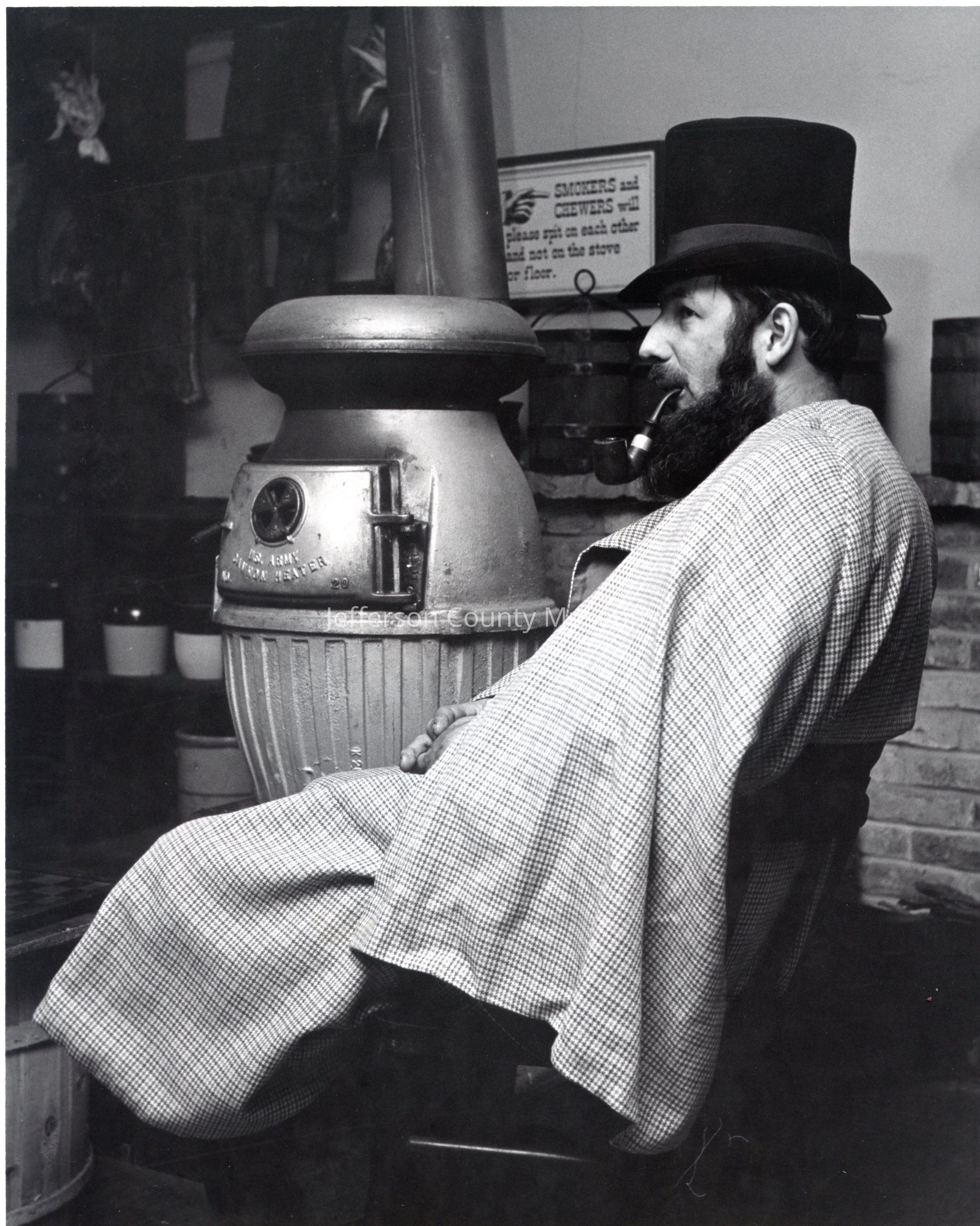 Arnold Schofield, park ranger reenactor, blacksmith, Harpers Ferry NHP circa 1977. Schofield seated in dry goods store.