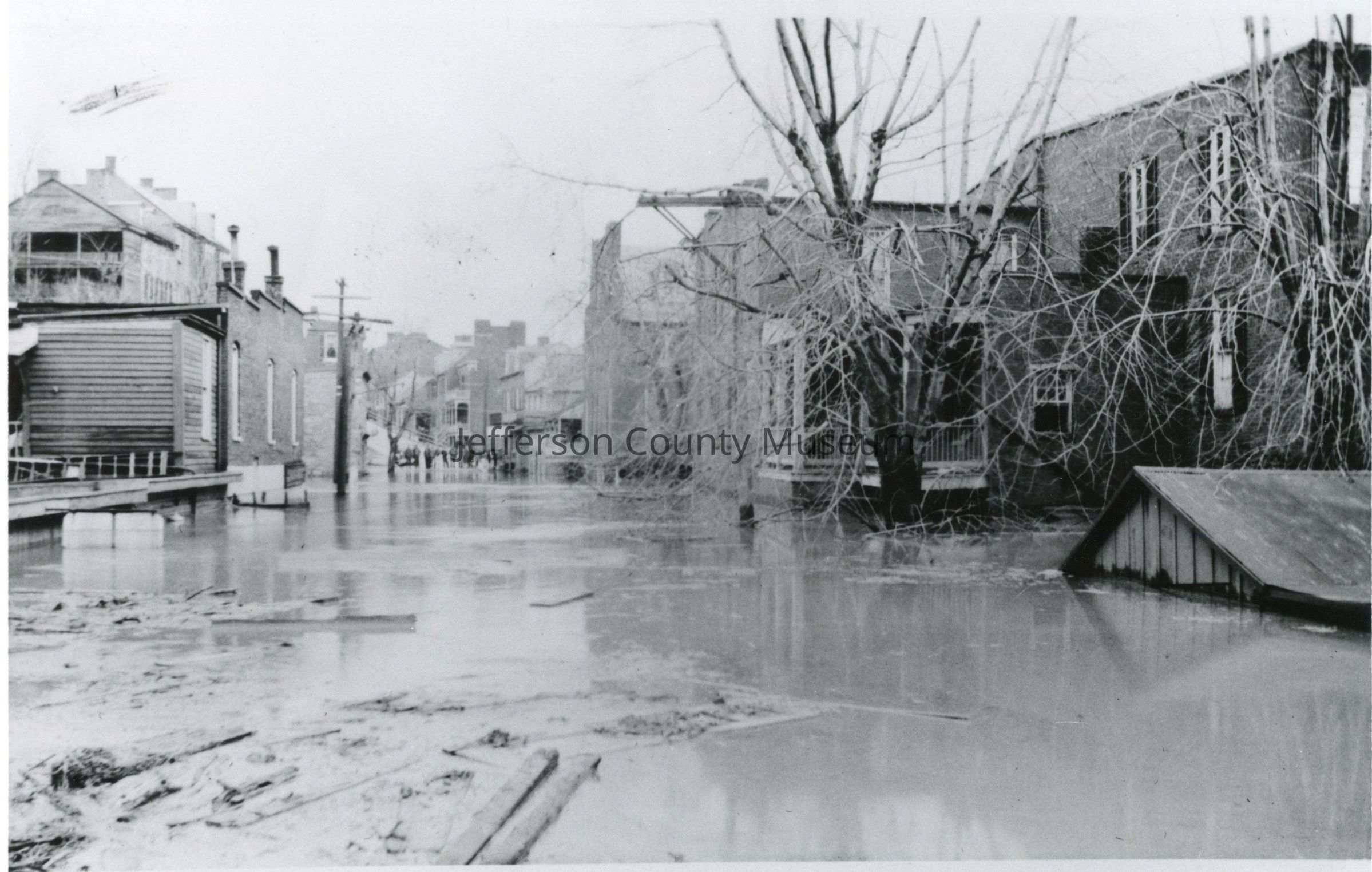 Flood of March 18, 1936 at Harpers Ferry. view is from the Winchester and Potomac Railroad tracks. Buildings on Arsenal Square on right. Harper's house visible in upper left corner. High Street shown in center of the photograph.