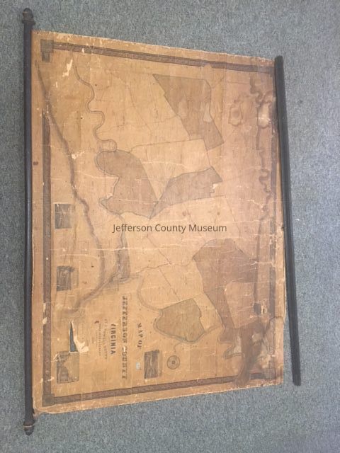 1852 map of Jefferson County, VIrginia, by S. Howell Brown showing farms and the owners' names. Includes population table and table of the fall in the Shenandoah River. Insets include views of Charles Town, Sheperdstown, Harpers Ferry, and Shannondale Springs. Wooden roller along one end, wooden stretcher along opposite end. Size does not include roller or stretcher.Acquisition