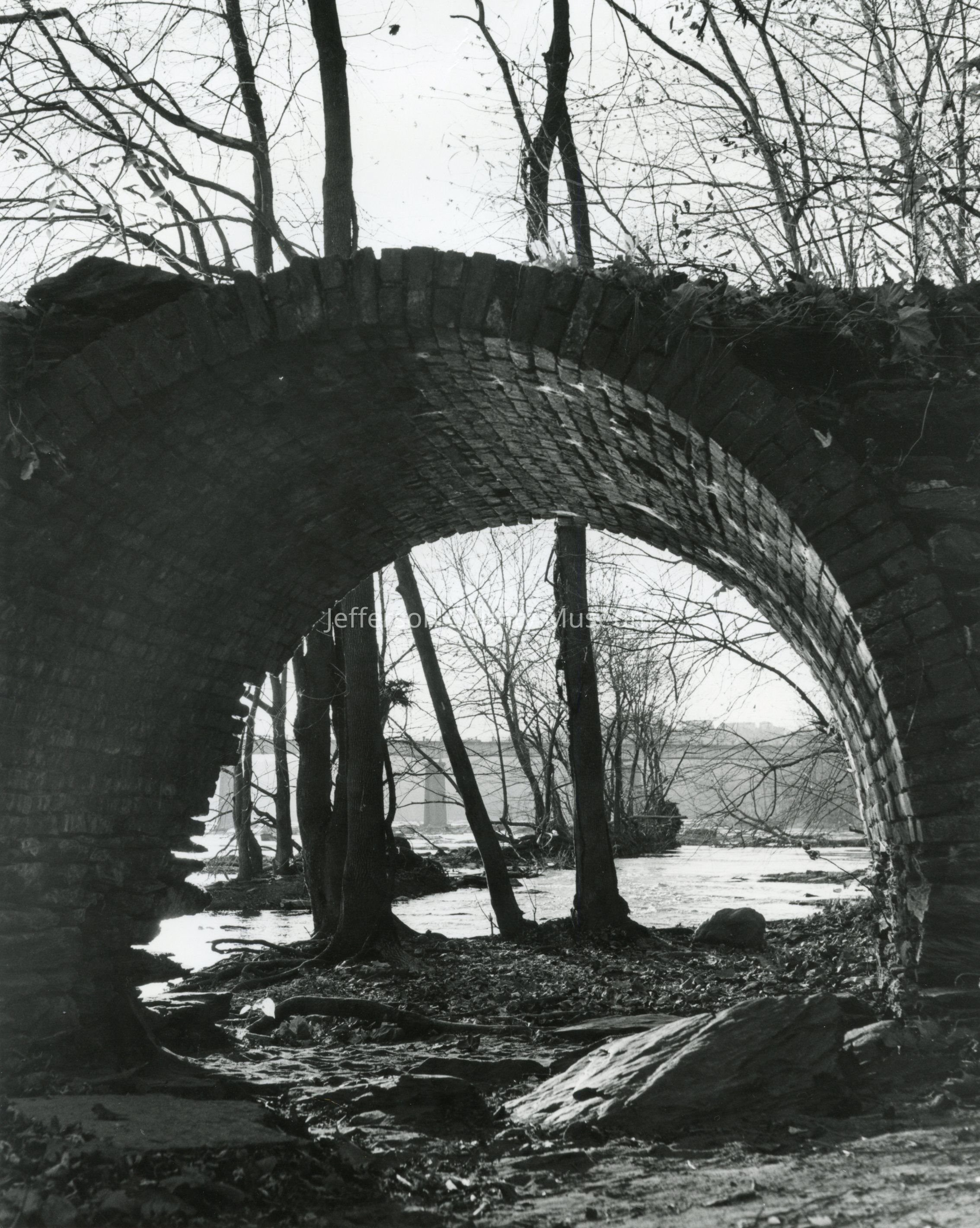 Intake arches on Viginius Island. View looking through the downstream (eastern) side. Remains of Herr's Dam can be seen. Shenandoah River bridge (Route 340) seen in background.