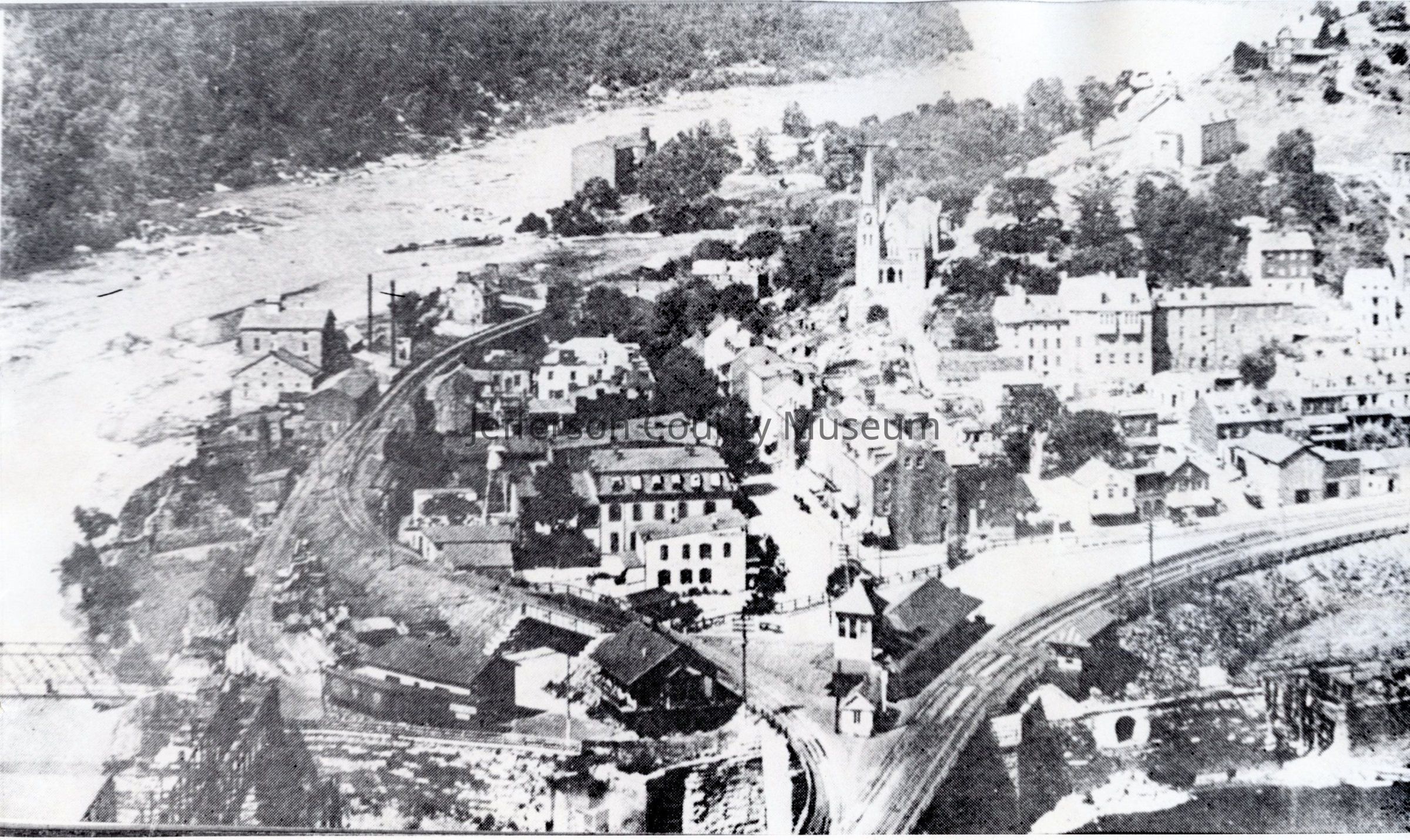 C. 1897 view of Lower Town Harpers Ferry and "The Point" from Maryland Heights. The new Baltimore and Ohio Railroad mainline track and passenger depot (bottom center) were opened just two years earlier, covering the old U. S. Musket Factory grounds with a 20-foot embankment. Also shown: the Market House, old Paymaster's House and the Winchester & Potomac Railroad tracks (center); St. Peter's Catholic Church, St. John's Episcopal Church, and the Harper Cemetery (top center); and Harpers House and Marmion Row (right center).Acquisition