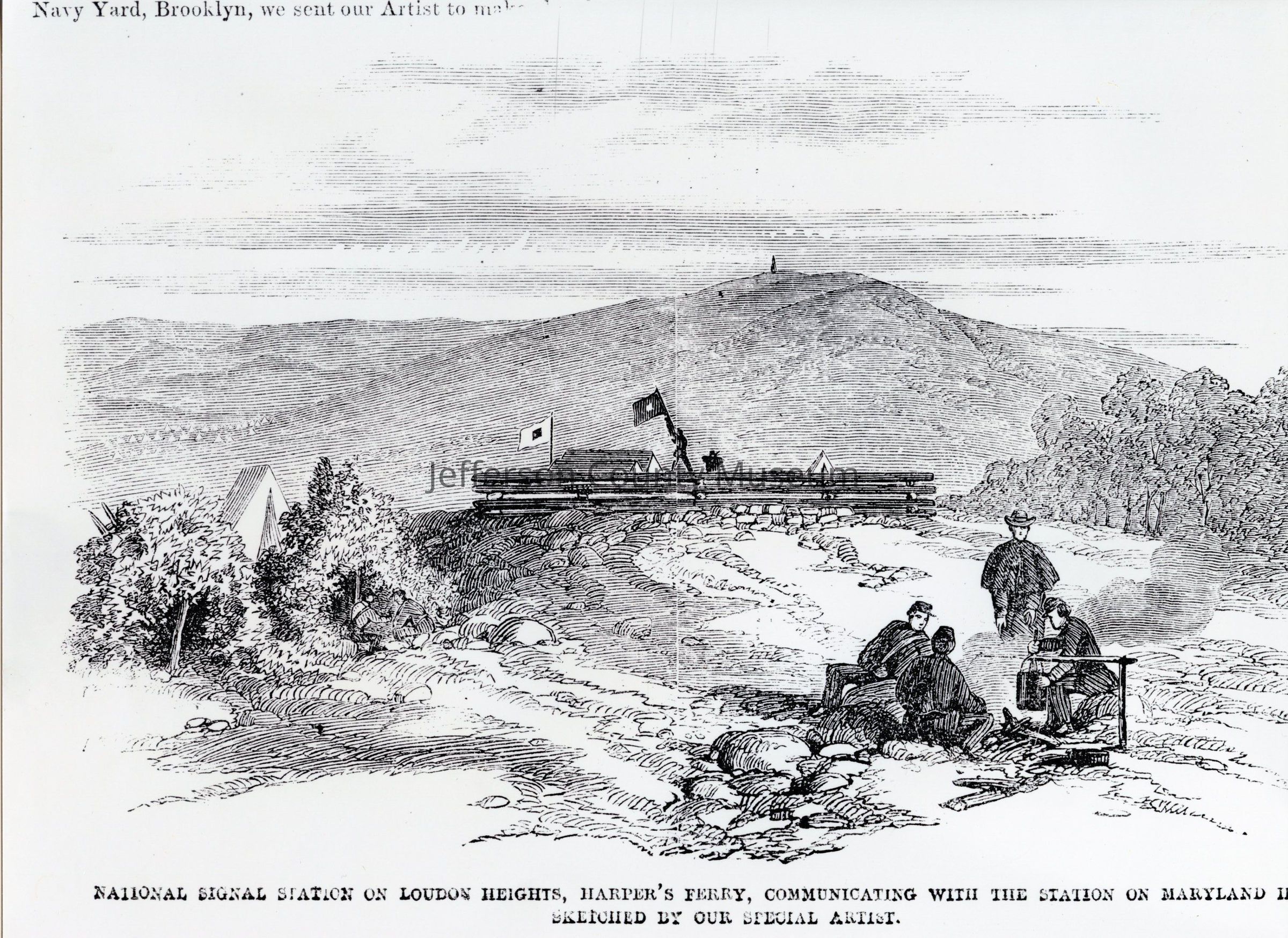National Signal Station on Loudon [sic] Heights, Harper's Ferry, communicating with the station on Maryland Heights, sketched by our special artist. From: Harper's Weekly, November 1862.