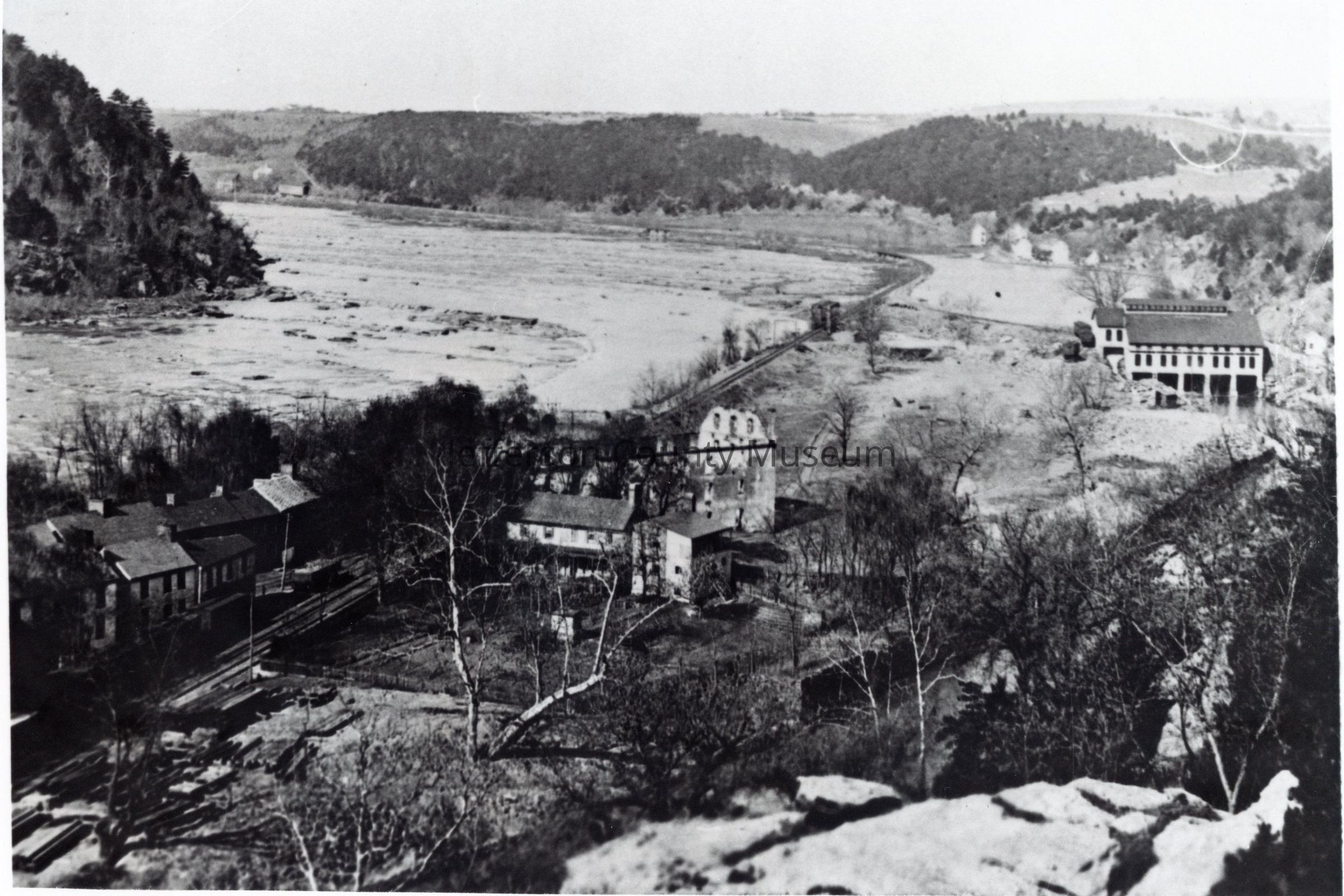 This c. 1888 view of Virginius Island shows the new Shenandoah Pulp Company mill (upper right) with Lake Quigley behind it. The ruins of Herr's Mill, burned by Confederate raiders in October 1861, are still visible in the center of the island.
