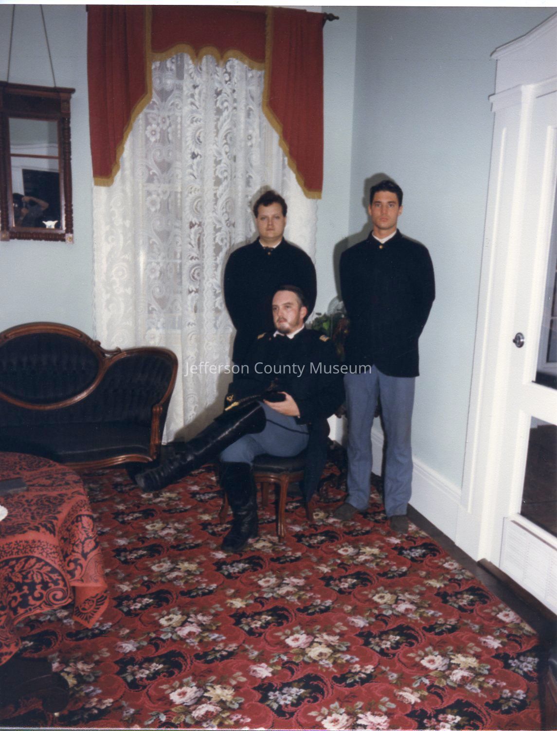 According to a Harpers Ferry Park Ranger, Park Ranger Susan Journell is in the purple dress standing behind Park Ranger David Larsen. Supervisory Park Ranger John King is seated in front of 2 other staff. Park Ranger Melinda Day is in the green striped dress.