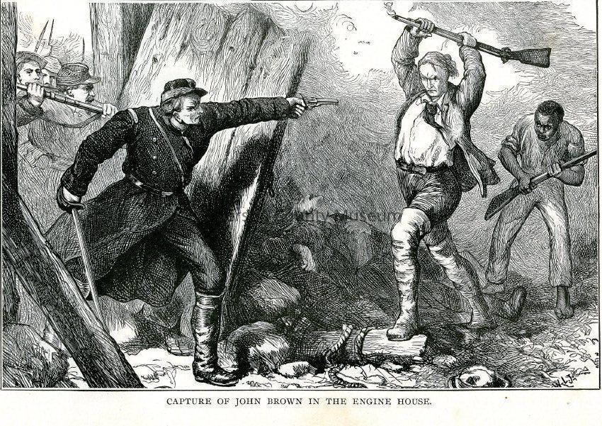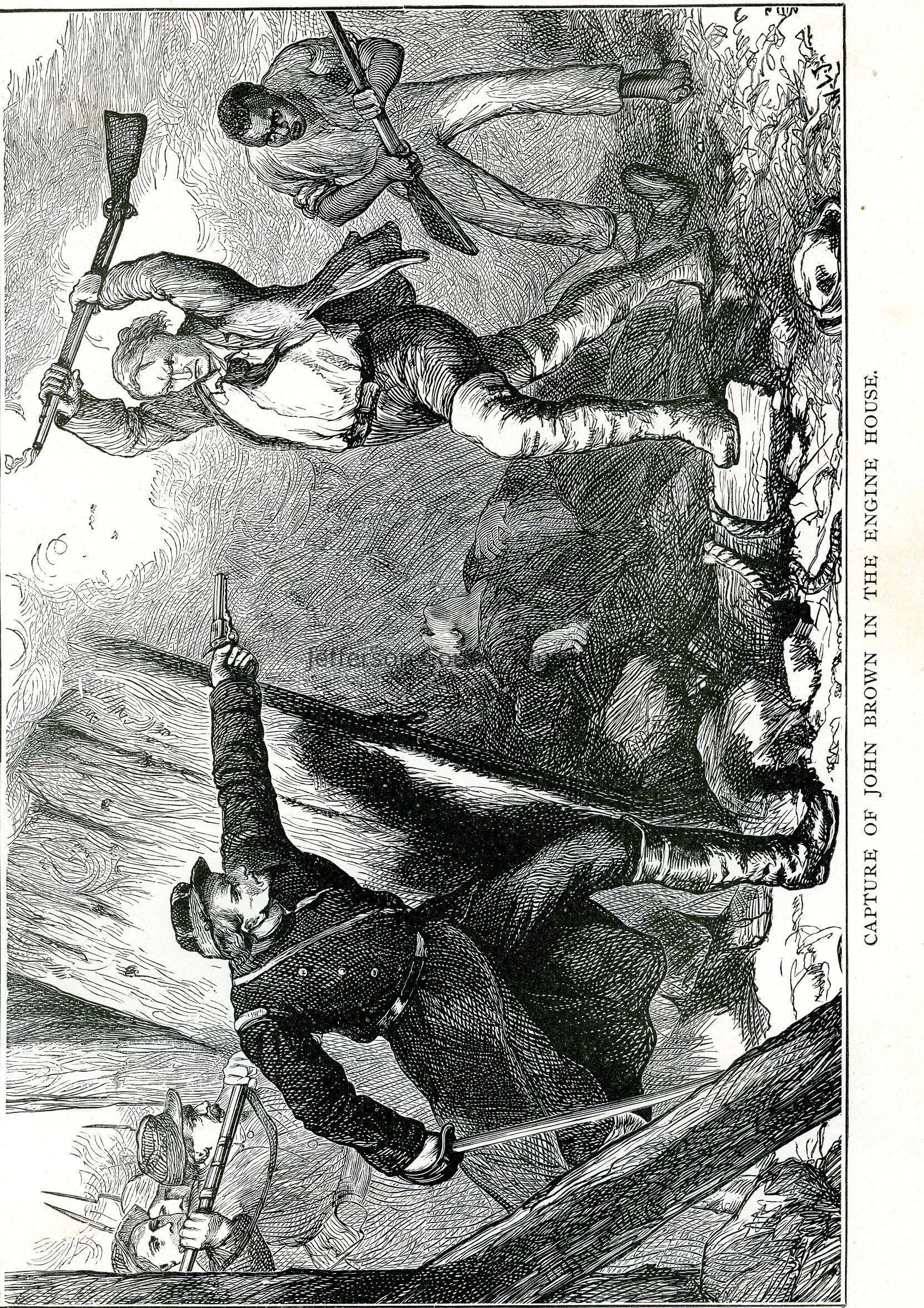 Capture of John Brown in the engine house. Wood cut engraving. W.L.J. in lower right hand side. Page from a book.Acquisition