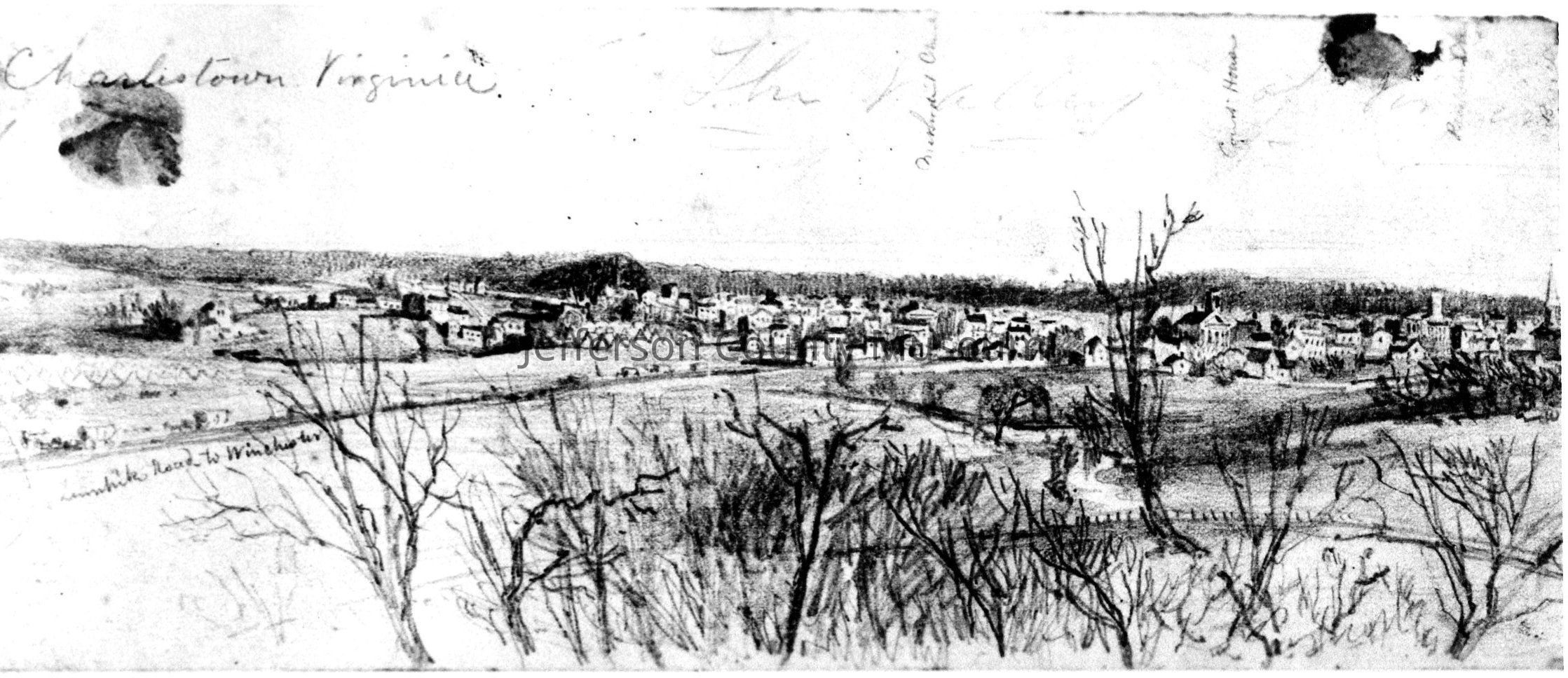 Charlestown, Virginia. The Valley of Virginia. Looking towards Harpers Ferry. Copy of one half (left side) of a panoramic sketch of Charlestown done by Alfred R. Waud in March 1862. View is from the grounds of Cassilus. Although difficult to read in this copy, Waud identified a number of buildings including the Court House as well as defensive positions of Union troops stationed in and around Charlestown.