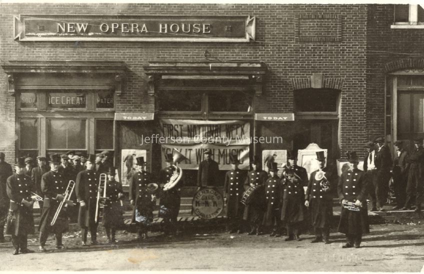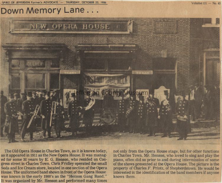 Digital image of a photograph from the "Down Memory Lane" section of the Spirit of Jefferson. Photo features Henson's Gang band standing in front of the New Opera House with uniforms and top hats holding instruments. At center, the bass drum says "Henson's Gang /Klean Kut Klassy /Charlestown". This slogan is likely a reference to the Klu Klux Klan. There are groups of men standing at either side. The Opera House's ice cream parlor can be seen in the background, as well as advertisements for upcoming performances and a large banner that says "First National Week/ 'Say it with Music'"Photograph Details