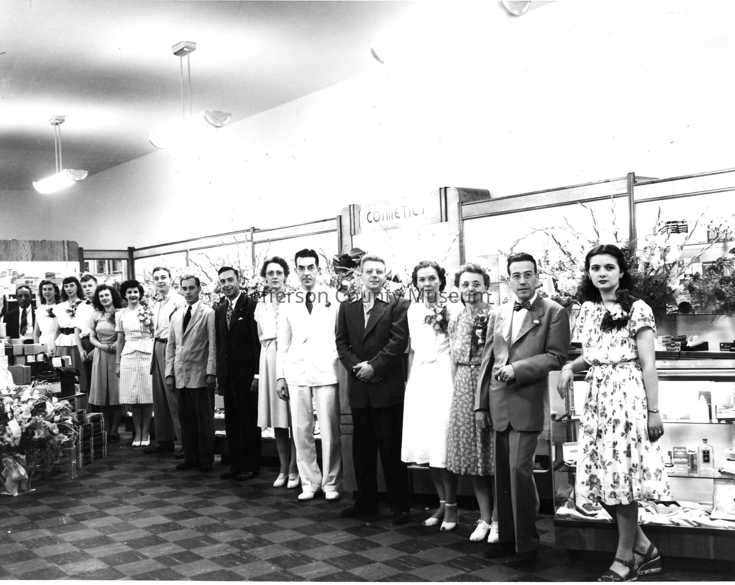 Nichols & Stuck Pharmacy. 114 West Washington Street. Photograph of staff [perhaps opening/Mayor Nick Carson in photograph]. Left to Right: 1. UNIDENTIFIED 2. Margaret Malone Barker 3. UNIDENTIFIED 4. Logan Lynch 5. UNIDENTIFIED 6. Janis S. Nichols 7. F. Dean Nichols 8. Mayor Nicholas Carson 9. UNIDENTIFIED 10. Wilhelmina P. Stuck 11. William B. Stuck 12. UNIDENTIFIED 13. UNIDENTIFIED 14. Rita G. Nichols 15. D. Shirley Nichols 16. Louise "Tucky" Pine Corbin