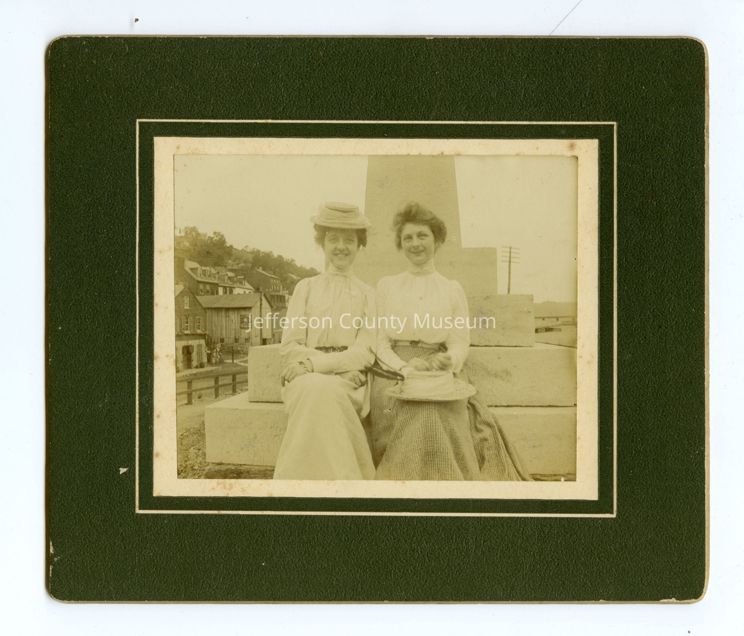 Mounted black and white photo of two women sitting on the base of the monument marking the original site of the armory's Fire Engine House which John Brown used as a fort during his raid on Harpers Ferry. Power lines, a stable belonging to "Jones" and other buildings are visible in the background.Acquisition