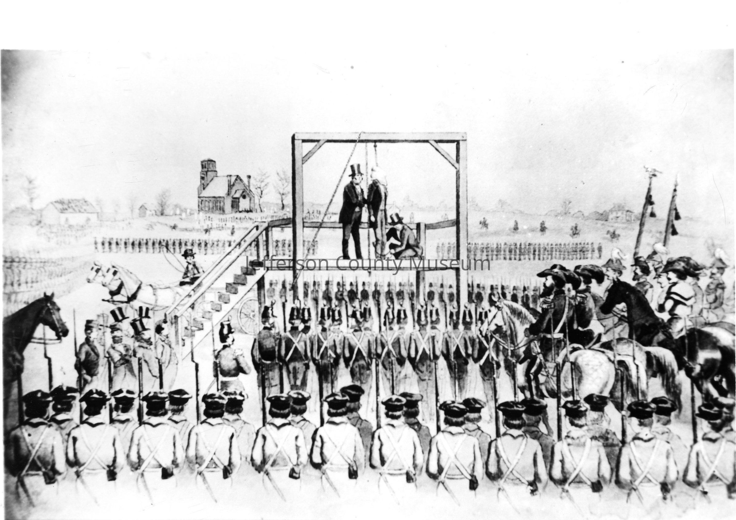 Charlestown, Virginia, Execution of John Brown, December 2nd 1859. Copy of sketch by David Hunter Strother. Zion Episcopal Church visible in top left background.