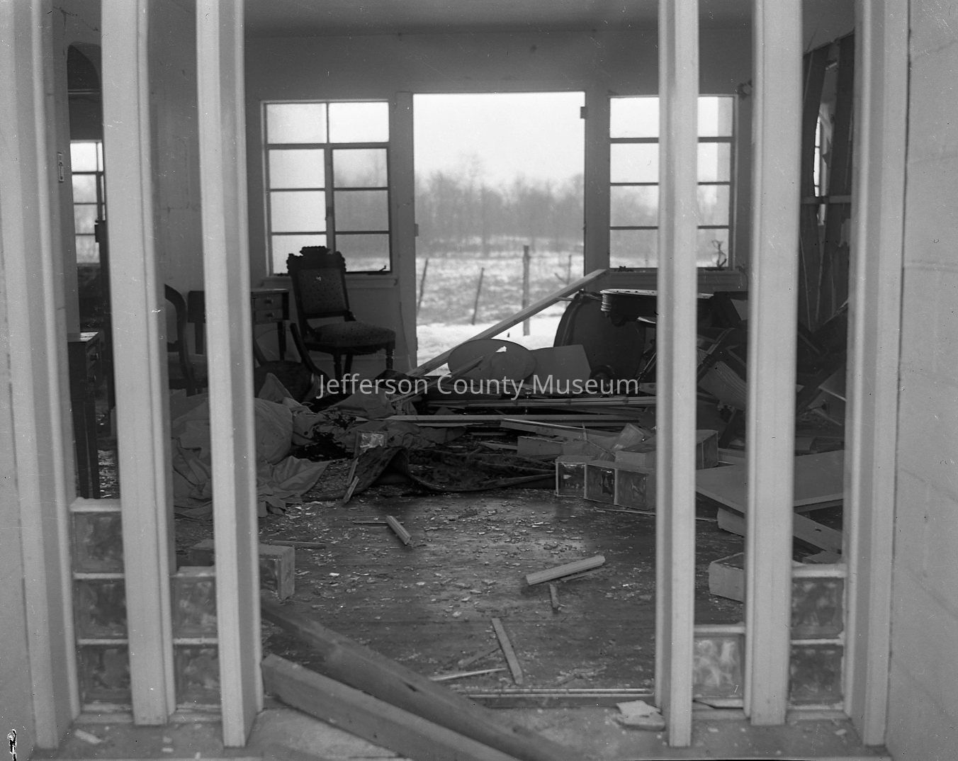 Dynamite truck explosion near Halltown on February 1, 1951. View is of the front door of the house occupied by Estelle Cobb. The photograph shows the extensive damage to the interior of the house. Billy Bates was standing at this door when the explosion occurred and was killed by the blast.