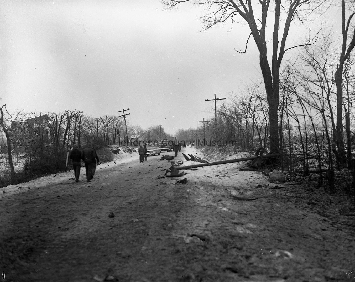 Dynamite truck explosion near Halltown on February 1, 1951. View is looking southwest along Route 340 just east of Halltown. The Cobb house can be seen on the left. A fire truck and ambulance from the Citizens Fire Company in Charles Town are parked near the Cobb house. A number of unidentified onlookers can be seen walking on Route 340 surveying the damage.