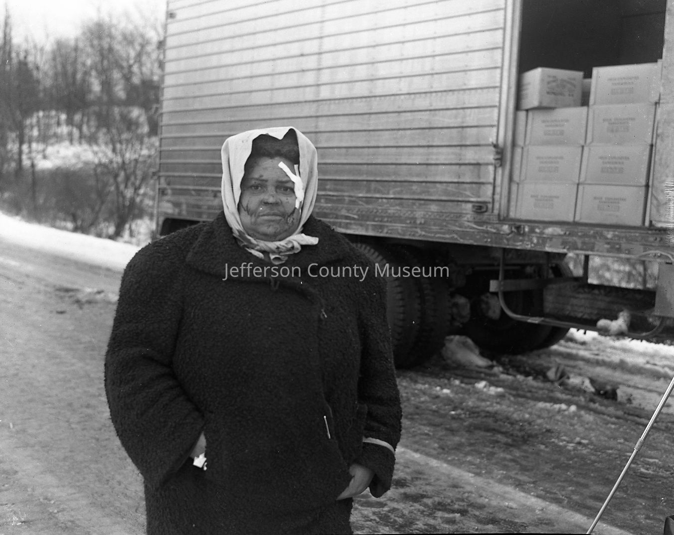 Dynamite truck explosion near Halltown on February 1, 1951. Unidentified woman with facial wounds (wounded by dynamite explosion?) standing along Route 340. A partially loaded dynamite truck can be seen in the background.